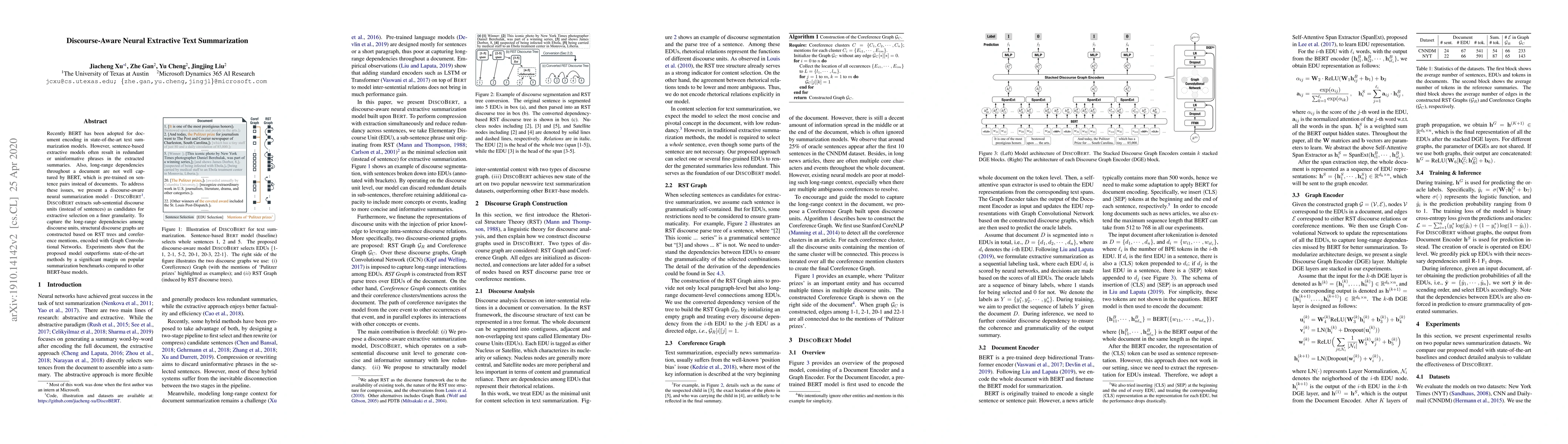 This research proposes DiscoBert, a discourse-aware neural summarization model that extracts sub-sentential discourse units to generate more informative summaries. It leverages structural discourse graphs and Graph Convolutional Networks to capture long-range dependencies, outperforming BERT-based models on summarization benchmarks.