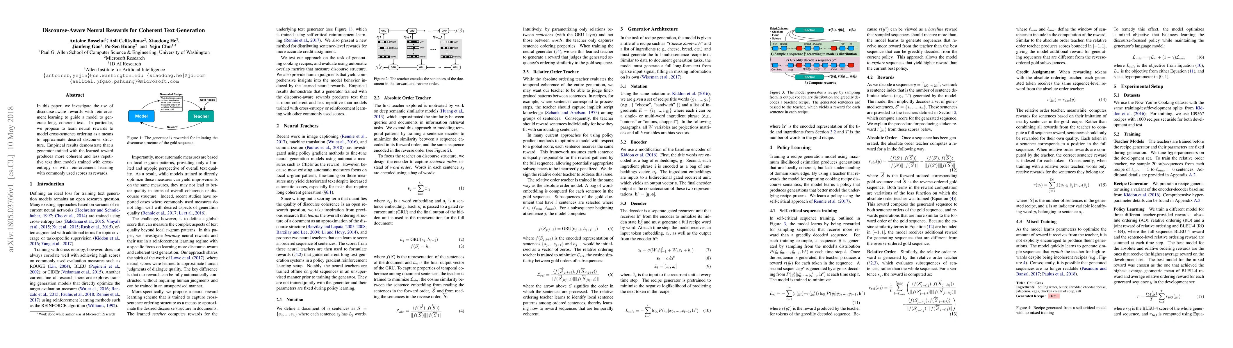 This paper explores discourse-aware neural rewards for reinforcement learning to enhance coherent text generation, showing that models trained with these rewards produce more coherent and less repetitive long-form text compared to traditional methods.