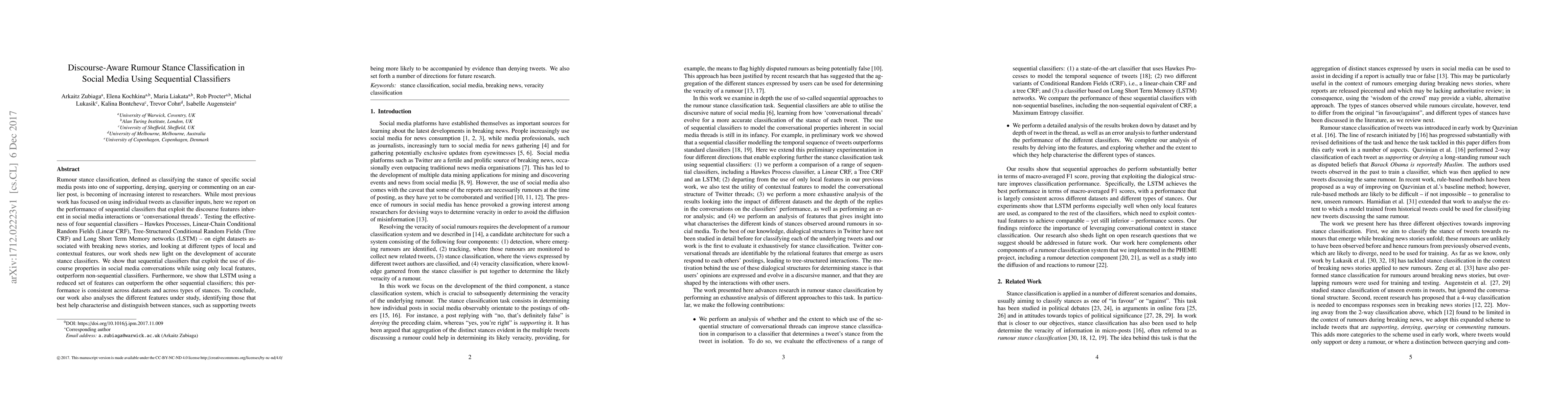 This paper investigates rumour stance classification using sequential classifiers that leverage discourse features in social media interactions. LSTM networks outperform other sequential classifiers like Linear CRF, Tree CRF, and Hawkes Processes, especially with a reduced feature set, across various datasets and stances.