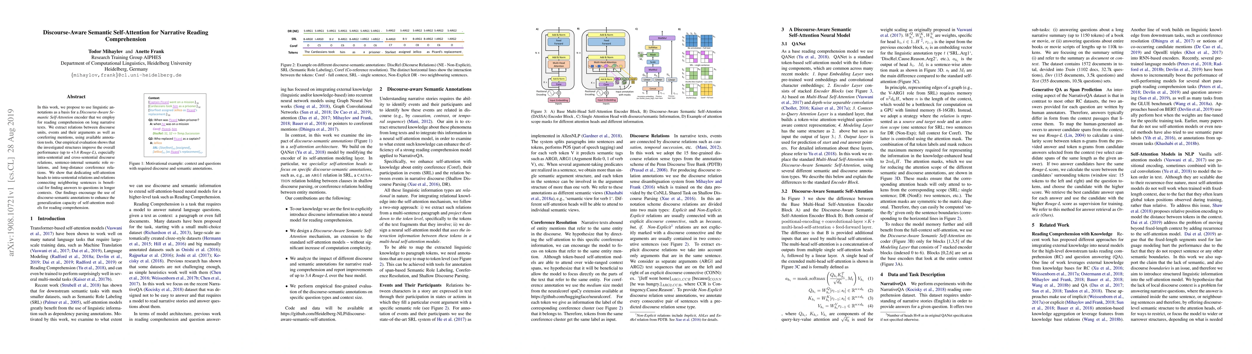 This paper introduces a Discourse-Aware Semantic Self-Attention encoder that leverages linguistic annotations to improve reading comprehension in long narrative texts. The model's performance is enhanced by focusing on intra-sentential and cross-sentential discourse relations, which aids in answering questions in extended contexts.