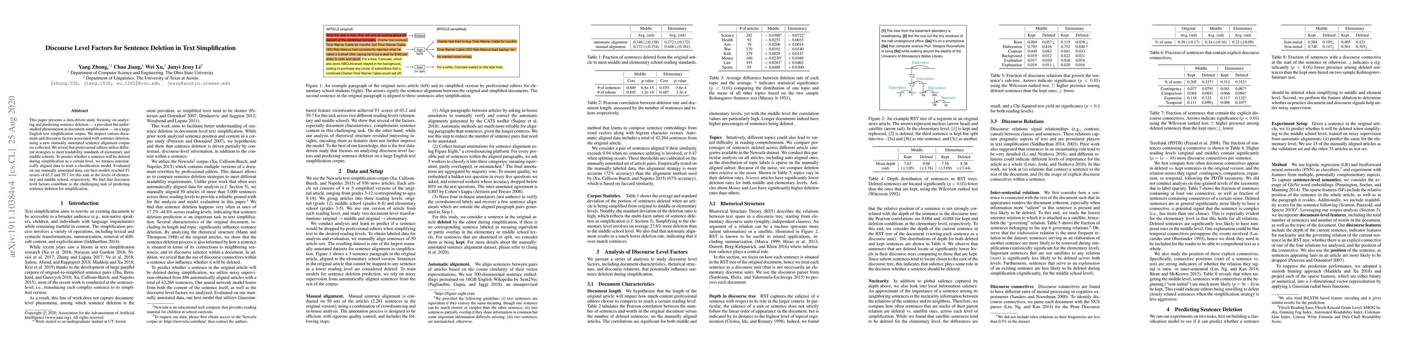 This study analyzes factors influencing sentence deletion in text simplification, revealing that professional editors adopt different strategies for varying readability levels. A classification model trained on aligned data achieved F1 scores of 65.2 and 59.7 for elementary and middle school simplification, respectively, highlighting the importance of discourse level factors in predicting sentence deletion.