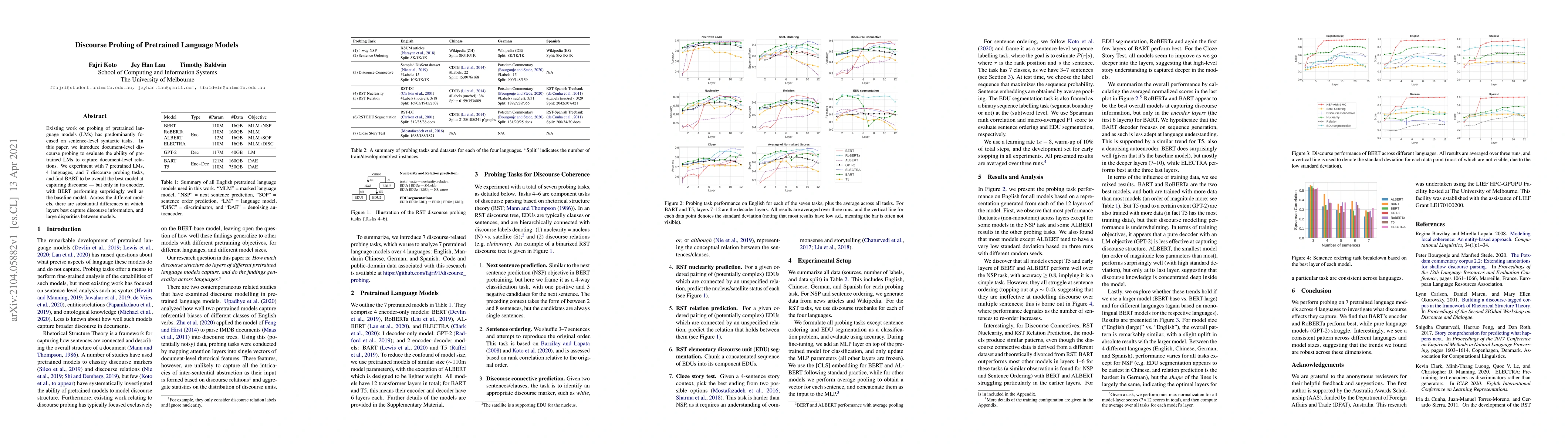 This paper explores document-level discourse probing to assess pretrained language models' ability to understand document-level relations, finding BART most effective overall but only in its encoder, with BERT surprisingly performing well as a baseline. Significant variation in which layers best capture discourse information is observed across different models.
