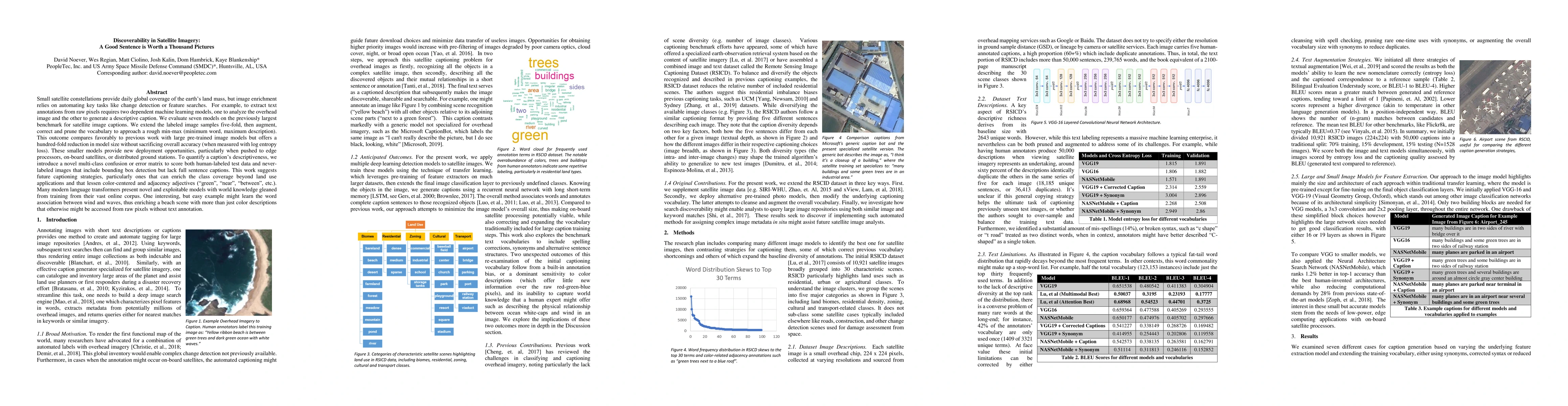 Small satellite constellations provide daily global coverage of the earth's landmass, but image enrichment relies on automating key tasks like change detection or feature searches. For example, to extract text annotations from raw pixels requires two dependent machine learning models, one to analyze the overhead image and the other to generate a descriptive caption. We evaluate seven models on the previously largest benchmark for satellite image captions. We extend the labeled image samples five-fold, then augment, correct and prune the vocabulary to approach a rough min-max (minimum word, maximum description). This outcome compares favorably to previous work with large pre-trained image models but offers a hundred-fold reduction in model size without sacrificing overall accuracy (when measured with log entropy loss). These smaller models provide new deployment opportunities, particularly when pushed to edge processors, on-board satellites, or distributed ground stations. To quantify a caption's descriptiveness, we introduce a novel multi-class confusion or error matrix to score both human-labeled test data and never-labeled images that include bounding box detection but lack full sentence captions. This work suggests future captioning strategies, particularly ones that can enrich the class coverage beyond land use applications and that lessen color-centered and adjacency adjectives ("green", "near", "between", etc.). Many modern language transformers present novel and exploitable models with world knowledge gleaned from training from their vast online corpus. One interesting, but easy example might learn the word association between wind and waves, thus enriching a beach scene with more than just color descriptions that otherwise might be accessed from raw pixels without text annotation.