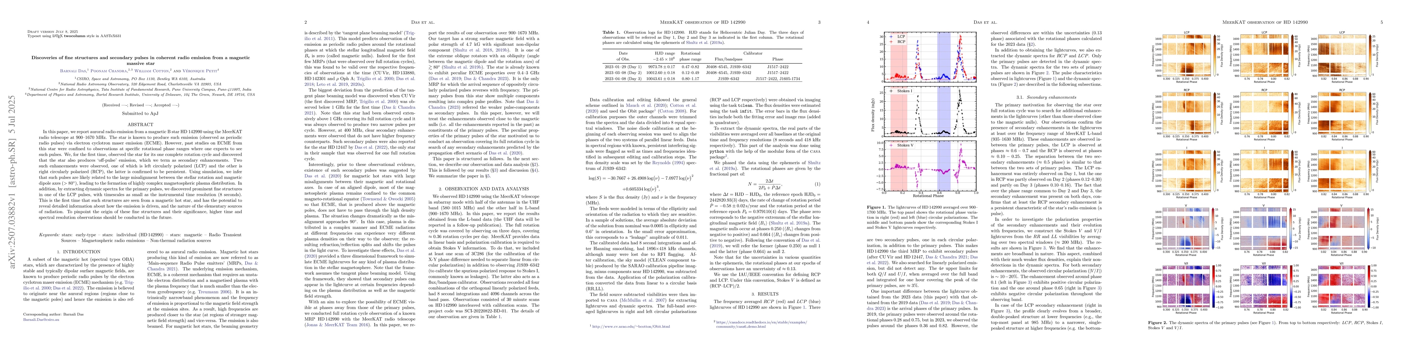 In this paper, we report auroral radio emission from a magnetic B star HD 142990 using the MeerKAT radio telescope at $900-1670$ MHz. The star is known to produce such emission (observed as periodic radio pulses) via electron cyclotron maser emission (ECME). However, past studies on ECME from this star were confined to observations at specific rotational phase ranges where one expects to see such pulses. We, for the first time, observed the star for its one complete rotation cycle and discovered that the star also produces 'off-pulse' emission, which we term as secondary enhancements. Two such enhancements were observed, one of which is left circularly polarized (LCP) and the other is right circularly polarized (RCP), the latter is confirmed to be persistent. Using simulation, we infer that such pulses are likely related to the large misalignment between the stellar rotation and magnetic dipole axes ($>80^\circ$), leading to the formation of highly complex magnetospheric plasma distribution. In addition, by extracting dynamic spectra for the primary pulses, we discovered prominent fine structures in one of the LCP pulses, with timescales as small as the instrumental time resolution (8 seconds). This is the first time that such structures are seen from a magnetic hot star, and has the potential to reveal detailed information about how the emission is driven, and the nature of the elementary sources of radiation. To pinpoint the origin of these fine structures and their significance, higher time and spectral resolution observations should be conducted in the future.