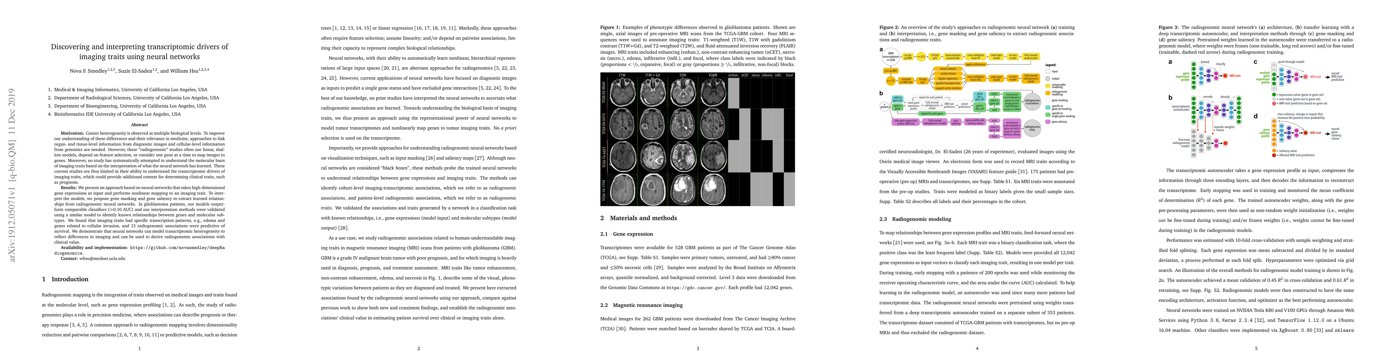 Motivation. Cancer heterogeneity is observed at multiple biological levels. To improve our understanding of these differences and their relevance in medicine, approaches to link organ- and tissue-level information from diagnostic images and cellular-level information from genomics are needed. However, these "radiogenomic" studies often use linear, shallow models, depend on feature selection, or consider one gene at a time to map images to genes. Moreover, no study has systematically attempted to understand the molecular basis of imaging traits based on the interpretation of what the neural network has learned. These current studies are thus limited in their ability to understand the transcriptomic drivers of imaging traits, which could provide additional context for determining clinical traits, such as prognosis. Results. We present an approach based on neural networks that takes high-dimensional gene expressions as input and performs nonlinear mapping to an imaging trait. To interpret the models, we propose gene masking and gene saliency to extract learned relationships from radiogenomic neural networks. In glioblastoma patients, our models outperform comparable classifiers (>0.10 AUC) and our interpretation methods were validated using a similar model to identify known relationships between genes and molecular subtypes. We found that imaging traits had specific transcription patterns, e.g., edema and genes related to cellular invasion, and 15 radiogenomic associations were predictive of survival. We demonstrate that neural networks can model transcriptomic heterogeneity to reflect differences in imaging and can be used to derive radiogenomic associations with clinical value.