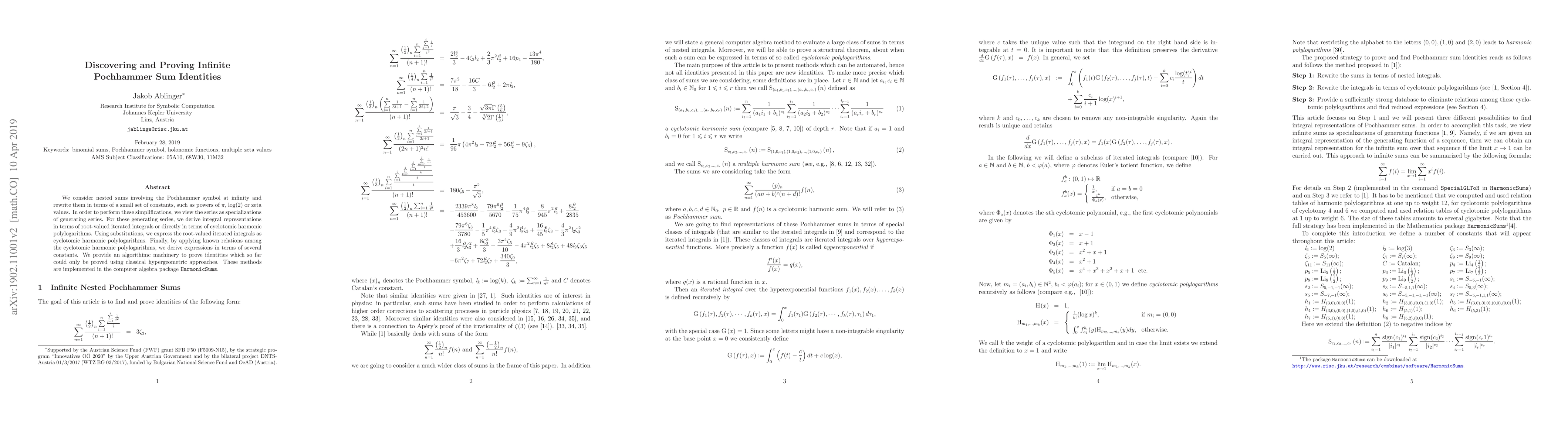 This paper discovers and proves infinite Pochhammer sum identities by expressing nested sums in terms of constants like powers of π, log(2), and zeta values. It utilizes generating series, integral representations, and cyclotomic harmonic polylogarithms to achieve these simplifications, and the results are implemented in the HarmonicSums computer algebra package.