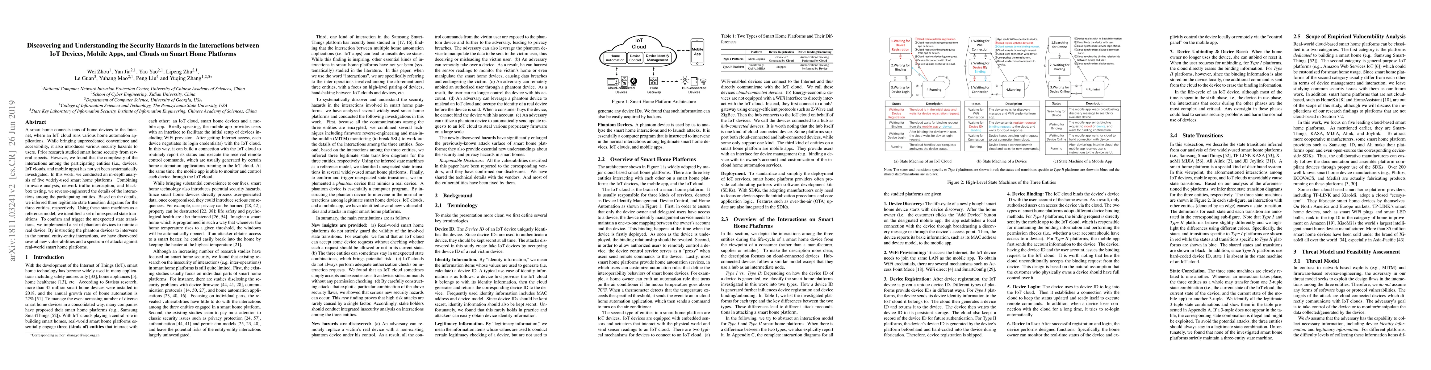 This paper investigates security hazards in smart home platforms by analyzing interactions among IoT devices, mobile apps, and IoT clouds. Through detailed reverse engineering and testing, the authors identified unexpected state transitions and new vulnerabilities, revealing significant security risks in smart home ecosystems.