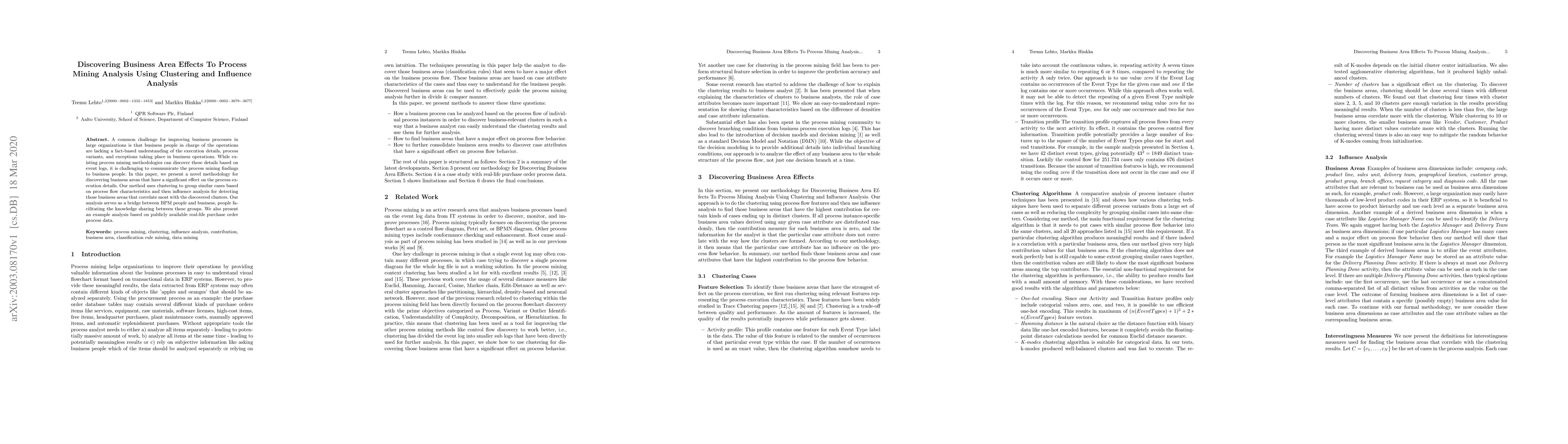 This paper introduces a novel methodology for identifying business areas that significantly impact process execution details using clustering and influence analysis. The approach aims to bridge the gap between business process management and business personnel by facilitating knowledge sharing through process mining findings.