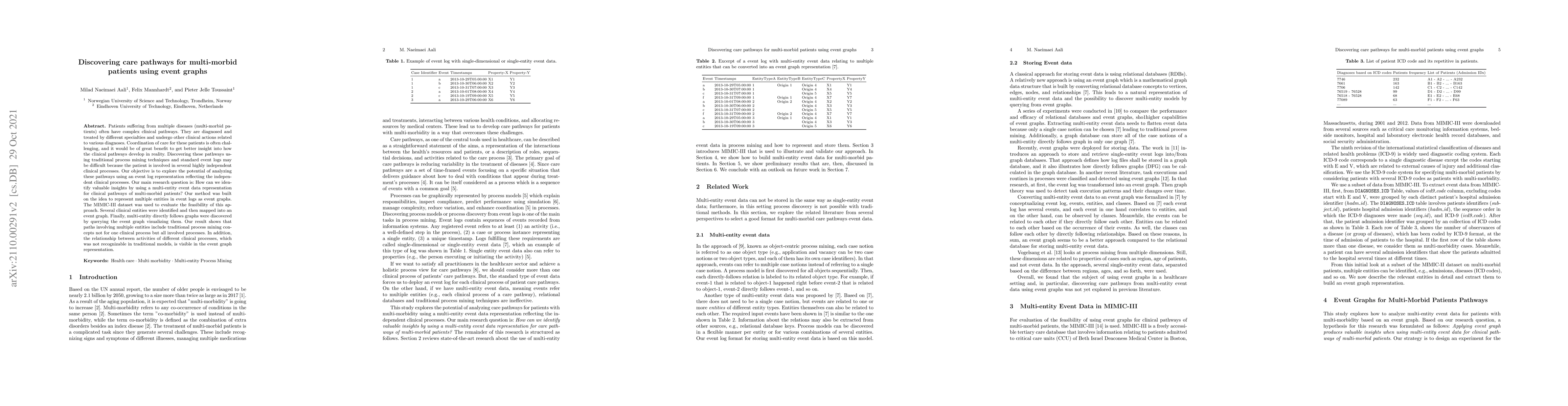 Patients suffering from multiple diseases (multi-morbid patients) often have complex clinical pathways. They are diagnosed and treated by different specialties and undergo other clinical actions related to various diagnoses. Coordination of care for these patients is often challenging, and it would be of great benefit to get better insight into how the clinical pathways develop in reality. Discovering these pathways using traditional process mining techniques and standard event logs may be difficult because the patient is involved in several highly independent clinical processes. Our objective is to explore the potential of analyzing these pathways using an event log representation reflecting the independent clinical processes. Our main research question is: How can we identify valuable insights by using a multi-entity event data representation for clinical pathways of multi-morbid patients? Our method was built on the idea to represent multiple entities in event logs as event graphs. The MIMIC-III data-set was used to evaluate the feasibility of this approach. Several clinical entities were identified and then mapped into an event graph. Finally, multi-entity directly follows graphs were discovered by querying the event graph visualizing them. Our result shows that paths involving multiple entities include traditional process mining concepts not for one clinical process but all involved processes. In addition, the relationship between activities of different clinical processes, which was not recognizable in traditional models, is visible in the event graph representation.