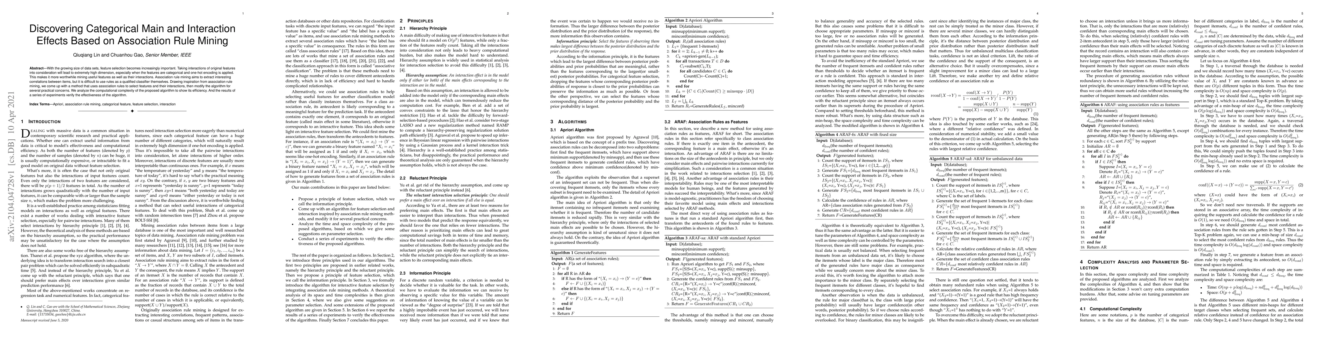 This paper proposes a method using association rule mining to select significant categorical features and their interactions for feature selection, addressing high-dimensionality issues. The modified algorithm is shown to be efficient and effective through computational complexity analysis and experimental validation.