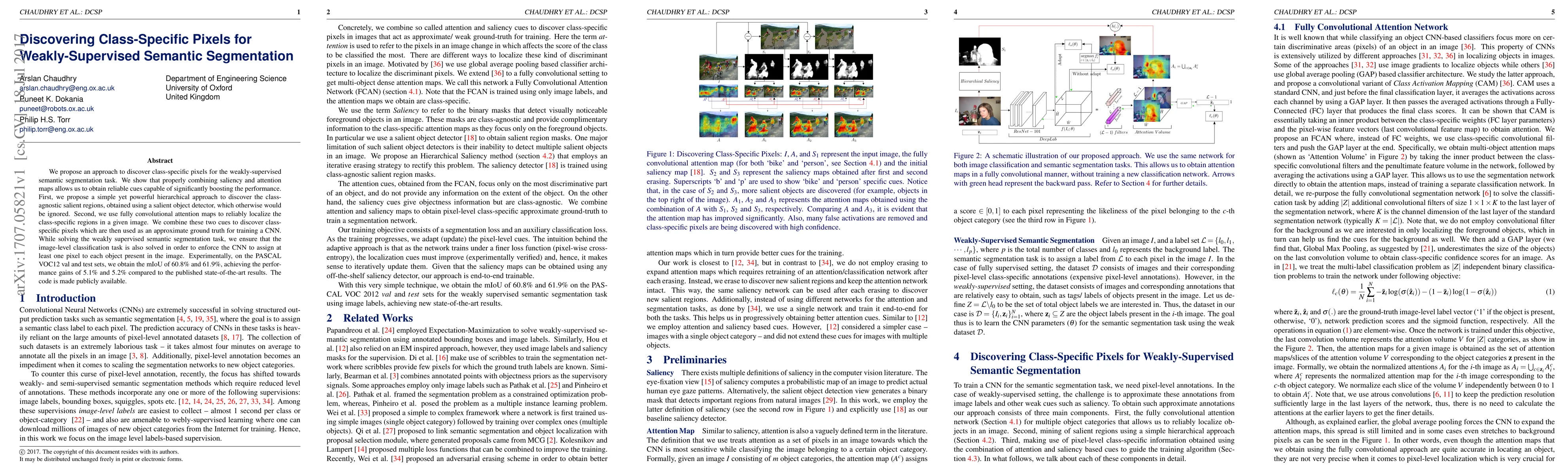 This research introduces a method for weakly-supervised semantic segmentation by identifying class-specific pixels through a combination of saliency and attention maps. The approach leverages salient regions and attention maps to enhance segmentation performance, achieving notable improvements over existing methods on the PASCAL VOC12 dataset. The authors emphasize the integration of image-level classification to ensure comprehensive object coverage.