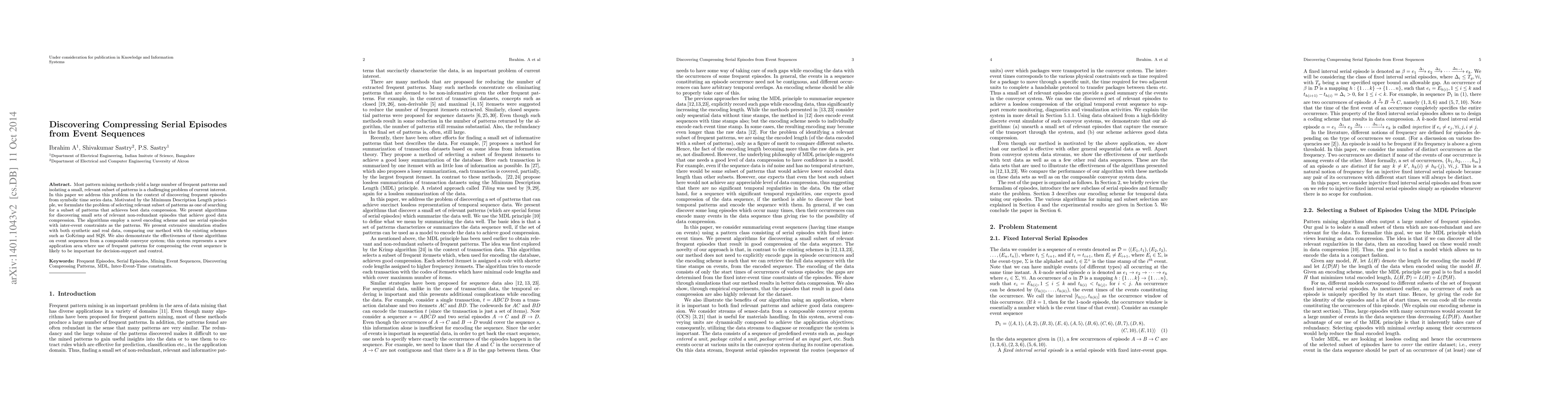 This paper proposes algorithms to discover a small set of relevant frequent episodes from event sequences using the Minimum Description Length principle, achieving effective data compression. The method is demonstrated to be effective in identifying relevant episodes in data streams from distributed sensors in a conveyor system.