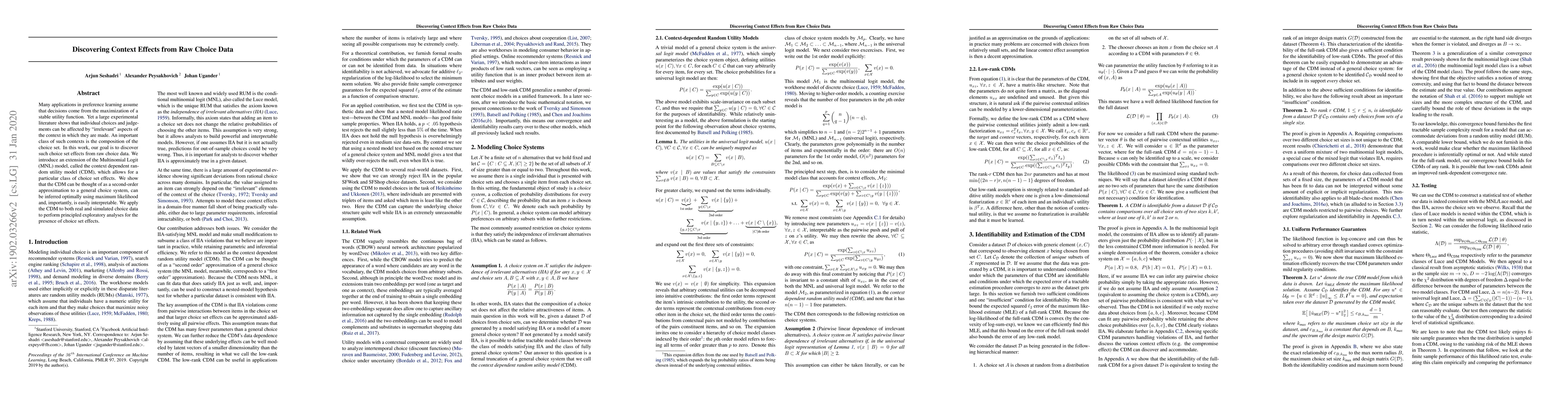 Many applications in preference learning assume that decisions come from the maximization of a stable utility function. Yet a large experimental literature shows that individual choices and judgements can be affected by "irrelevant" aspects of the context in which they are made. An important class of such contexts is the composition of the choice set. In this work, our goal is to discover such choice set effects from raw choice data. We introduce an extension of the Multinomial Logit (MNL) model, called the context dependent random utility model (CDM), which allows for a particular class of choice set effects. We show that the CDM can be thought of as a second-order approximation to a general choice system, can be inferred optimally using maximum likelihood and, importantly, is easily interpretable. We apply the CDM to both real and simulated choice data to perform principled exploratory analyses for the presence of choice set effects.