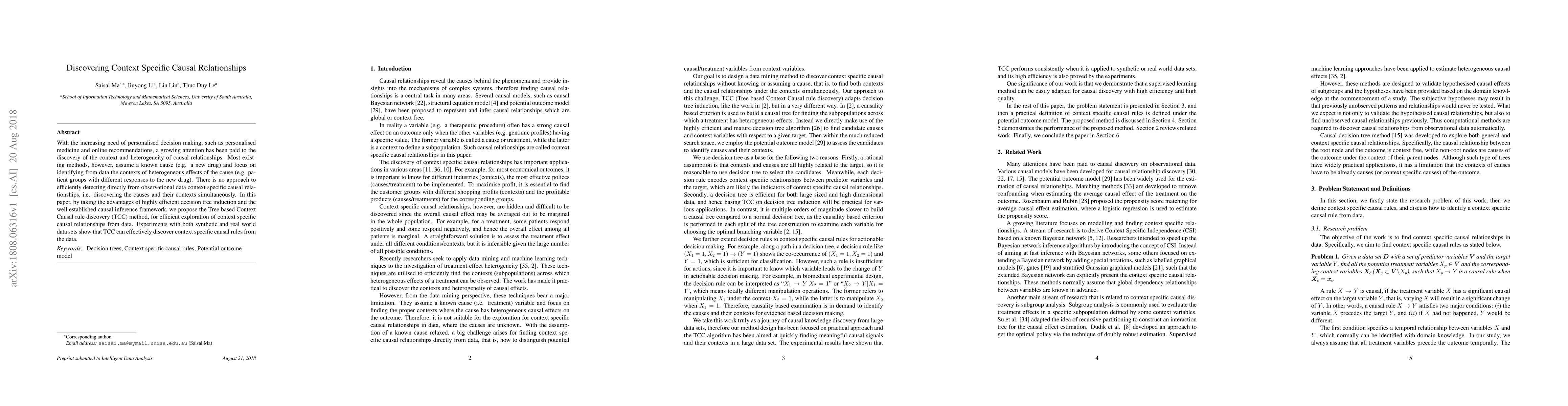 Researchers propose a new method called TCC to discover context-specific causal relationships from observational data. It uses decision tree induction and causal inference framework to effectively find causes and their contexts simultaneously.