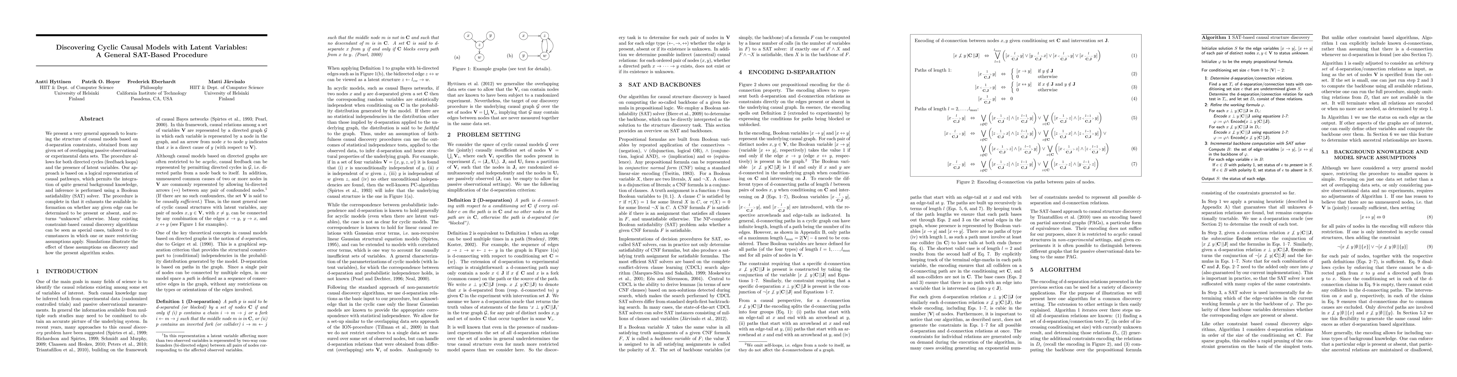 We present a very general approach to learning the structure of causal models based on d-separation constraints, obtained from any given set of overlapping passive observational or experimental data sets. The procedure allows for both directed cycles (feedback loops) and the presence of latent variables. Our approach is based on a logical representation of causal pathways, which permits the integration of quite general background knowledge, and inference is performed using a Boolean satisfiability (SAT) solver. The procedure is complete in that it exhausts the available information on whether any given edge can be determined to be present or absent, and returns "unknown" otherwise. Many existing constraint-based causal discovery algorithms can be seen as special cases, tailored to circumstances in which one or more restricting assumptions apply. Simulations illustrate the effect of these assumptions on discovery and how the present algorithm scales.