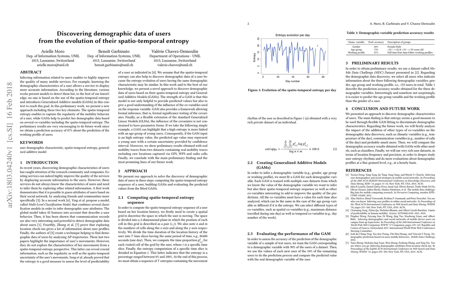 Inferring information related to users enables to highly improve the quality of many mobile services. For example, knowing the demographic characteristics of a user allows a service to display more accurate information. According to the literature, various works present models to detect them but, to the best of our knowledge, no one is based on the use of the spatio-temporal entropy and introduces Generalized Additive models (GAMs) in this context to reach this goal. In this preliminary work, we present a new approach including these two key elements. The spatio-temporal entropy enables to capture the regularity of the mobility behavior of a user, while GAMs help to predict her demographic data based on several co-variables including the spatio-temporal entropy. The preliminary results are very encouraging to do future work since we obtain a prediction accuracy of 87% about the prediction of the working profile of users.
