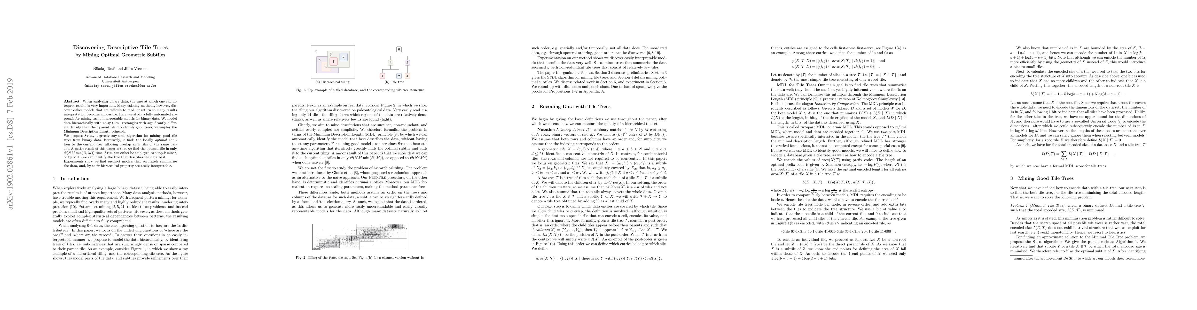 When analysing binary data, the ease at which one can interpret results is very important. Many existing methods, however, discover either models that are difficult to read, or return so many results interpretation becomes impossible. Here, we study a fully automated approach for mining easily interpretable models for binary data. We model data hierarchically with noisy tiles-rectangles with significantly different density than their parent tile. To identify good trees, we employ the Minimum Description Length principle. We propose STIJL, a greedy any-time algorithm for mining good tile trees from binary data. Iteratively, it finds the locally optimal addition to the current tree, allowing overlap with tiles of the same parent. A major result of this paper is that we find the optimal tile in only $\Theta(NM\min(N, M))$ time. STIJL can either be employed as a top-$k$ miner, or by MDL we can identify the tree that describes the data best. Experiments show we find succinct models that accurately summarise the data, and, by their hierarchical property are easily interpretable.