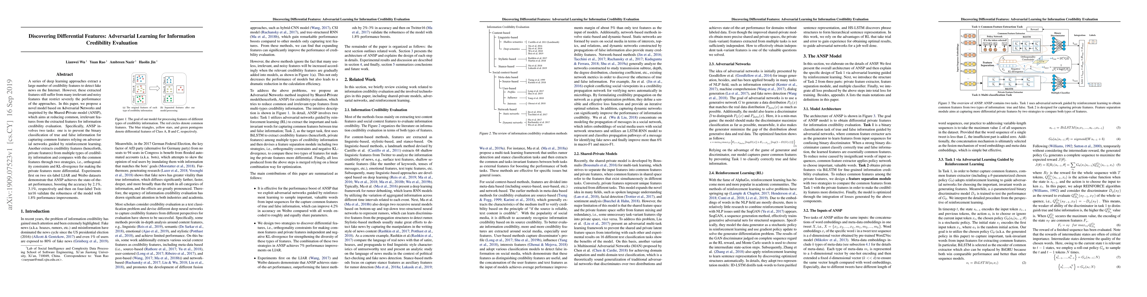 This paper introduces a novel Adversarial Networks model called ANSP for improving information credibility evaluation by extracting relevant features and reducing irrelevant noise. ANSP achieves state-of-the-art performance on multiple datasets, enhancing accuracy by 2.1%-3.1% by employing adversarial learning and orthogonality constraints.