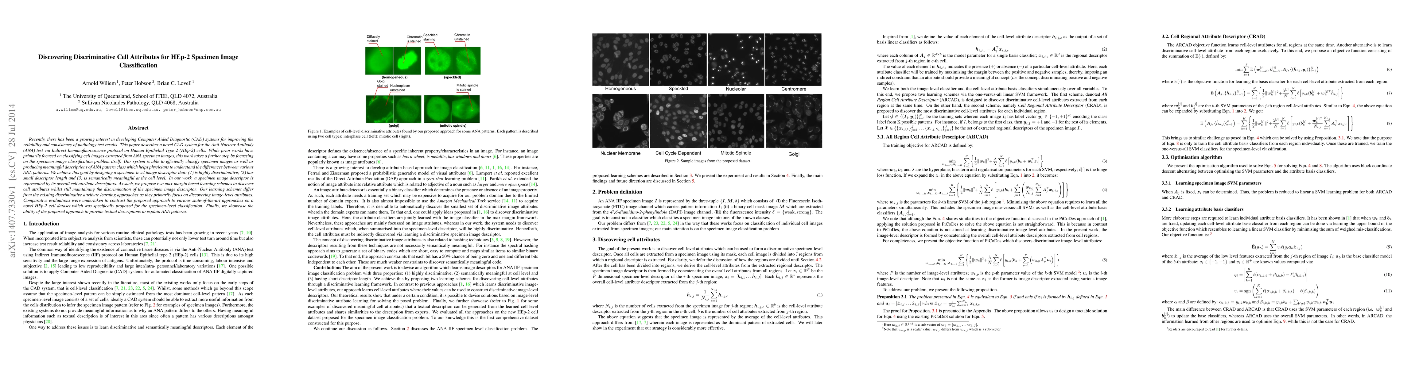 Recently, there has been a growing interest in developing Computer Aided Diagnostic (CAD) systems for improving the reliability and consistency of pathology test results. This paper describes a novel CAD system for the Anti-Nuclear Antibody (ANA) test via Indirect Immunofluorescence protocol on Human Epithelial Type 2 (HEp-2) cells. While prior works have primarily focused on classifying cell images extracted from ANA specimen images, this work takes a further step by focussing on the specimen image classification problem itself. Our system is able to efficiently classify specimen images as well as producing meaningful descriptions of ANA pattern class which helps physicians to understand the differences between various ANA patterns. We achieve this goal by designing a specimen-level image descriptor that: (1) is highly discriminative; (2) has small descriptor length and (3) is semantically meaningful at the cell level. In our work, a specimen image descriptor is represented by its overall cell attribute descriptors. As such, we propose two max-margin based learning schemes to discover cell attributes whilst still maintaining the discrimination of the specimen image descriptor. Our learning schemes differ from the existing discriminative attribute learning approaches as they primarily focus on discovering image-level attributes. Comparative evaluations were undertaken to contrast the proposed approach to various state-of-the-art approaches on a novel HEp-2 cell dataset which was specifically proposed for the specimen-level classification. Finally, we showcase the ability of the proposed approach to provide textual descriptions to explain ANA patterns.