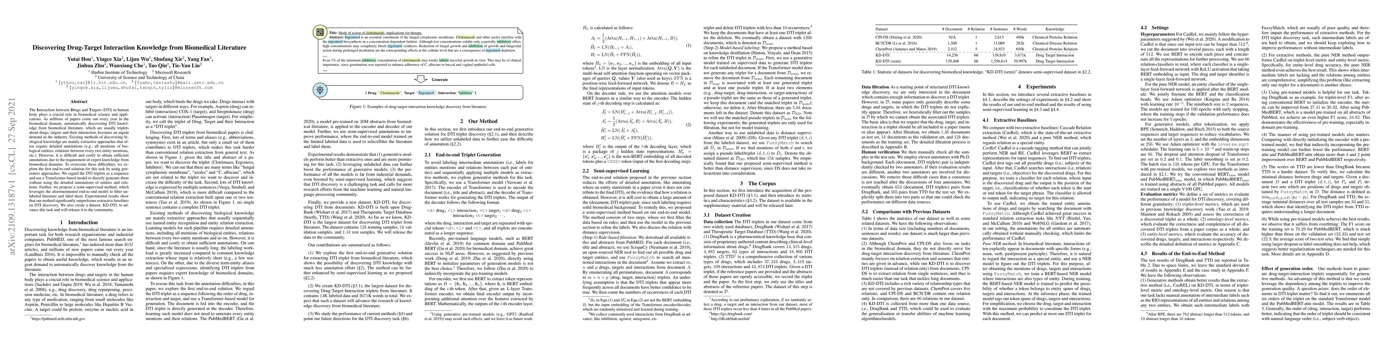 This paper presents an end-to-end generative approach using Transformer models for discovering Drug-Target Interaction (DTI) knowledge from biomedical literature without requiring detailed annotations. The proposed semi-supervised method outperforms traditional extractive methods and introduces a new dataset, KD-DTI, for advancing DTI discovery research.