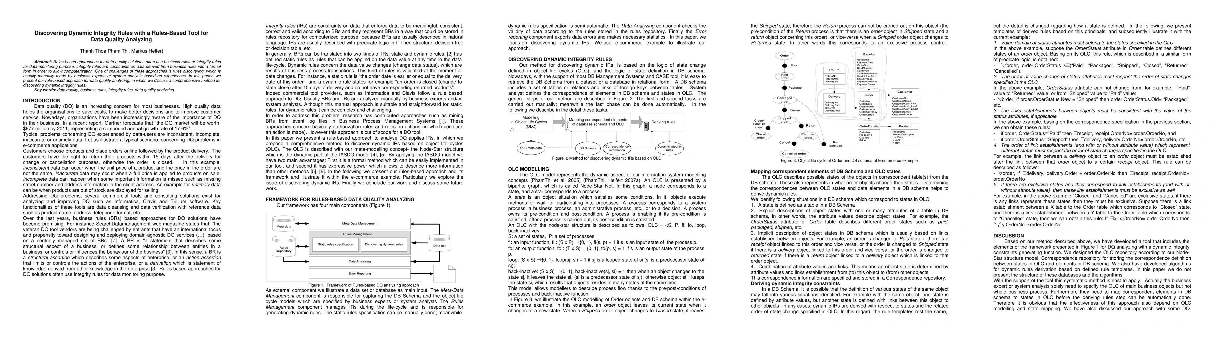 The research presents a rule-based approach for data quality analyzing, focusing on a comprehensive method for discovering dynamic integrity rules (IRs) based on object life cycles (OLC). The methodology involves modeling OLC using a Node-Star structure, mapping DB schema elements to OLC states, and deriving dynamic integrity constraints based on state changes and their order.