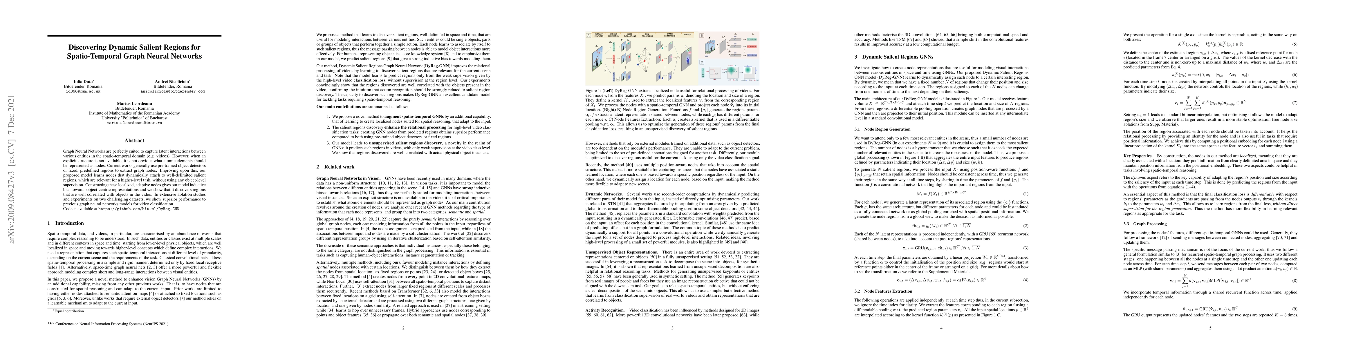 A new graph neural network model discovers dynamic salient regions in videos without explicit structure, improving performance over previous models on two challenging datasets.