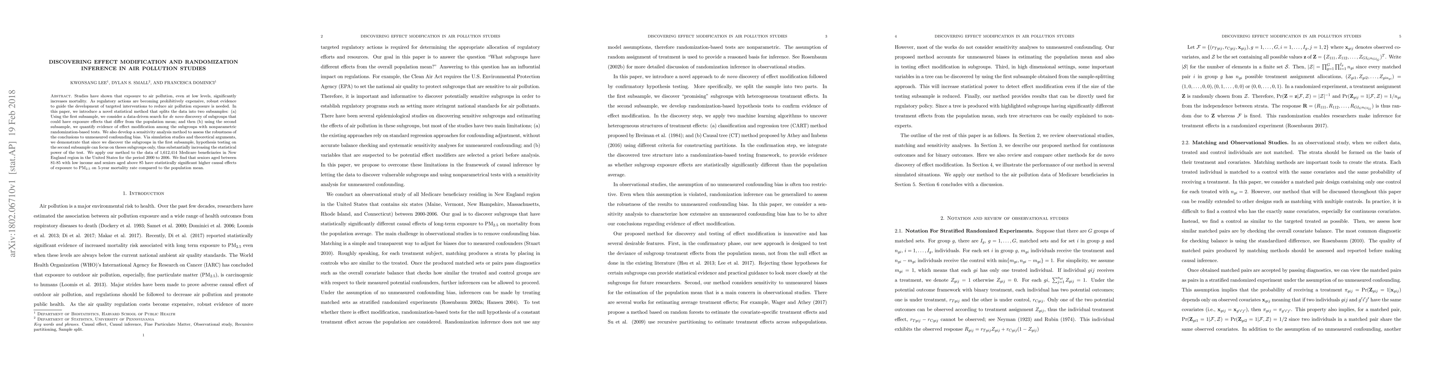 Studies have shown that exposure to air pollution, even at low levels, significantly increases mortality. As regulatory actions are becoming prohibitively expensive, robust evidence to guide the development of targeted interventions to reduce air pollution exposure is needed. In this paper, we introduce a novel statistical method that splits the data into two subsamples: (a) Using the first subsample, we consider a data-driven search for $\textit{de novo}$ discovery of subgroups that could have exposure effects that differ from the population mean; and then (b) using the second subsample, we quantify evidence of effect modification among the subgroups with nonparametric randomization-based tests. We also develop a sensitivity analysis method to assess the robustness of the conclusions to unmeasured confounding bias. Via simulation studies and theoretical arguments, we demonstrate that since we discover the subgroups in the first subsample, hypothesis testing on the second subsample can focus on theses subgroups only, thus substantially increasing the statistical power of the test. We apply our method to the data of 1,612,414 Medicare beneficiaries in New England region in the United States for the period 2000 to 2006. We find that seniors aged between 81-85 with low income and seniors aged above 85 have statistically significant higher causal effects of exposure to PM$_{2.5}$ on 5-year mortality rate compared to the population mean.