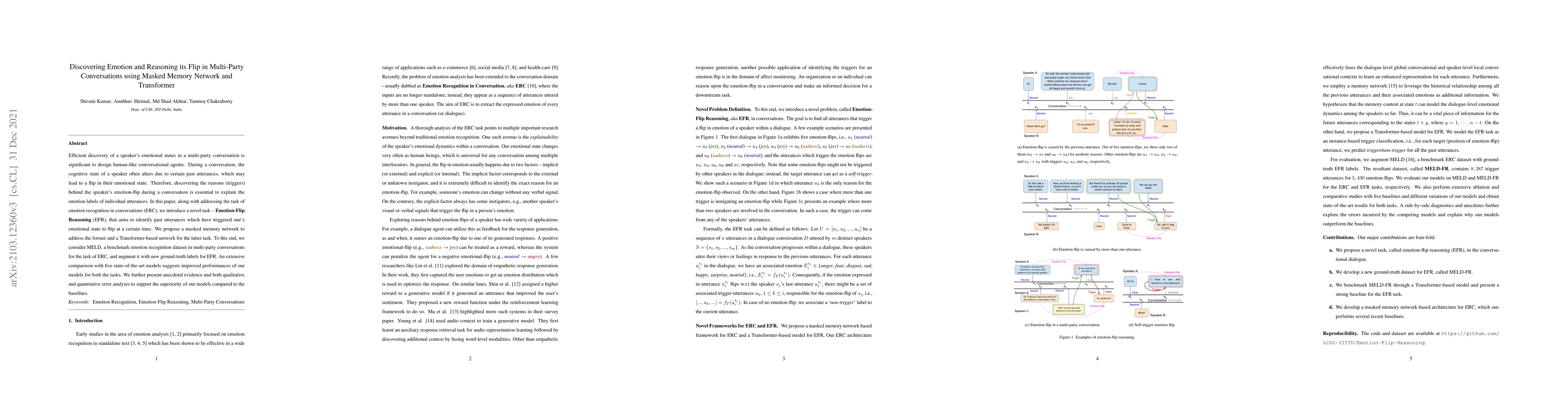 This paper introduces a novel Emotion-Flip Reasoning (EFR) task to identify triggers behind emotional state changes in multi-party conversations, alongside the Emotion Recognition in Conversations (ERC) task. The authors propose a masked memory network for ERC and a Transformer-based network for EFR, achieving improved performance over state-of-the-art models on the MELD dataset.