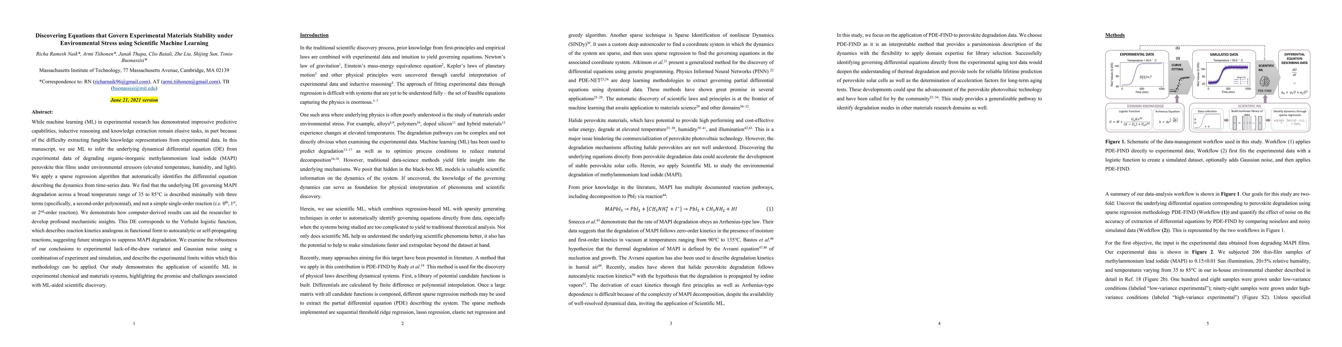 While machine learning (ML) in experimental research has demonstrated impressive predictive capabilities, inductive reasoning and knowledge extraction remain elusive tasks, in part because of the difficulty extracting fungible knowledge representations from experimental data. In this manuscript, we use ML to infer the underlying dynamical differential equation (DE) from experimental data of degrading organic-inorganic methylammonium lead iodide (MAPI) perovskite thin films under environmental stressors (elevated temperature, humidity, and light). We apply a sparse regression algorithm that automatically identifies the differential equation describing the dynamics from time-series data. We find that the underlying DE governing MAPI degradation across a broad temperature range of 35 to 85{\deg}C is described minimally with three terms (specifically, a second-order polynomial), and not a simple single-order reaction (i.e. 0th, 1st, or 2nd-order reaction). We demonstrate how computer-derived results can aid the researcher to develop profound mechanistic insights. This DE corresponds to the Verhulst logistic function, which describes reaction kinetics analogous in functional form to autocatalytic or self-propagating reactions, suggesting future strategies to suppress MAPI degradation. We examine the robustness of our conclusions to experimental luck-of-the-draw variance and Gaussian noise using a combination of experiment and simulation, and describe the experimental limits within which this methodology can be applied. Our study demonstrates the application of scientific ML in experimental chemical and materials systems, highlighting the promise and challenges associated with ML-aided scientific discovery.