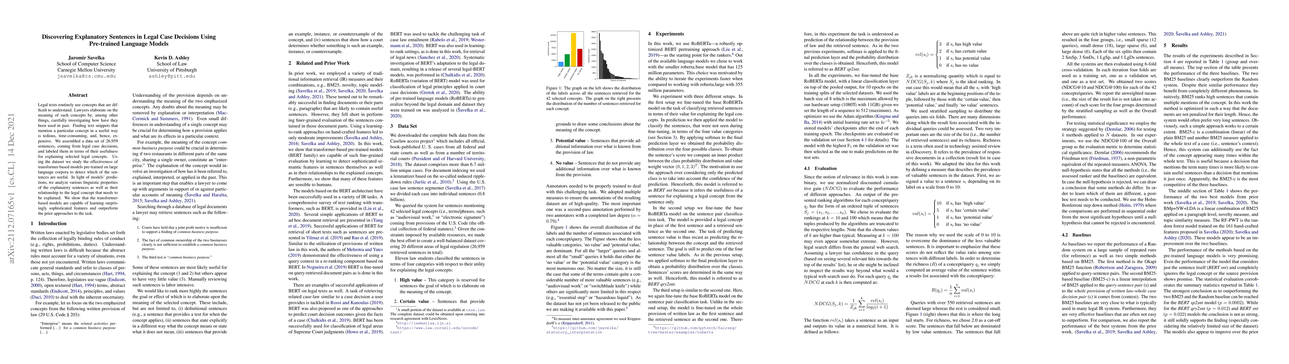 Legal texts routinely use concepts that are difficult to understand. Lawyers elaborate on the meaning of such concepts by, among other things, carefully investigating how have they been used in past. Finding text snippets that mention a particular concept in a useful way is tedious, time-consuming, and, hence, expensive. We assembled a data set of 26,959 sentences, coming from legal case decisions, and labeled them in terms of their usefulness for explaining selected legal concepts. Using the dataset we study the effectiveness of transformer-based models pre-trained on large language corpora to detect which of the sentences are useful. In light of models' predictions, we analyze various linguistic properties of the explanatory sentences as well as their relationship to the legal concept that needs to be explained. We show that the transformer-based models are capable of learning surprisingly sophisticated features and outperform the prior approaches to the task.