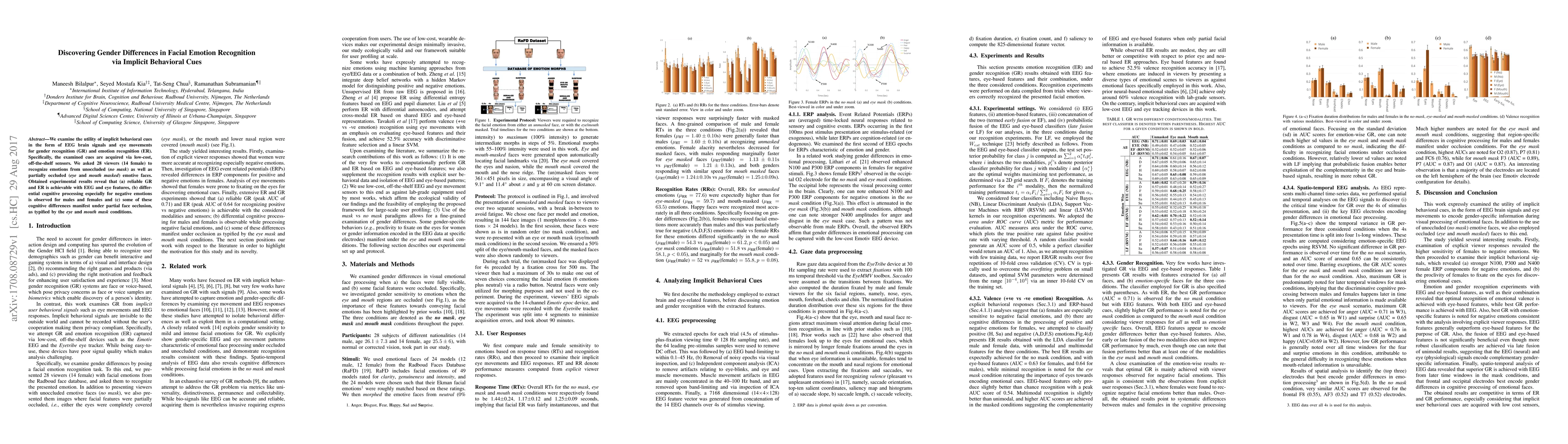 We examine the utility of implicit behavioral cues in the form of EEG brain signals and eye movements for gender recognition (GR) and emotion recognition (ER). Specifically, the examined cues are acquired via low-cost, off-the-shelf sensors. We asked 28 viewers (14 female) to recognize emotions from unoccluded (no mask) as well as partially occluded (eye and mouth masked) emotive faces. Obtained experimental results reveal that (a) reliable GR and ER is achievable with EEG and eye features, (b) differential cognitive processing especially for negative emotions is observed for males and females and (c) some of these cognitive differences manifest under partial face occlusion, as typified by the eye and mouth mask conditions.