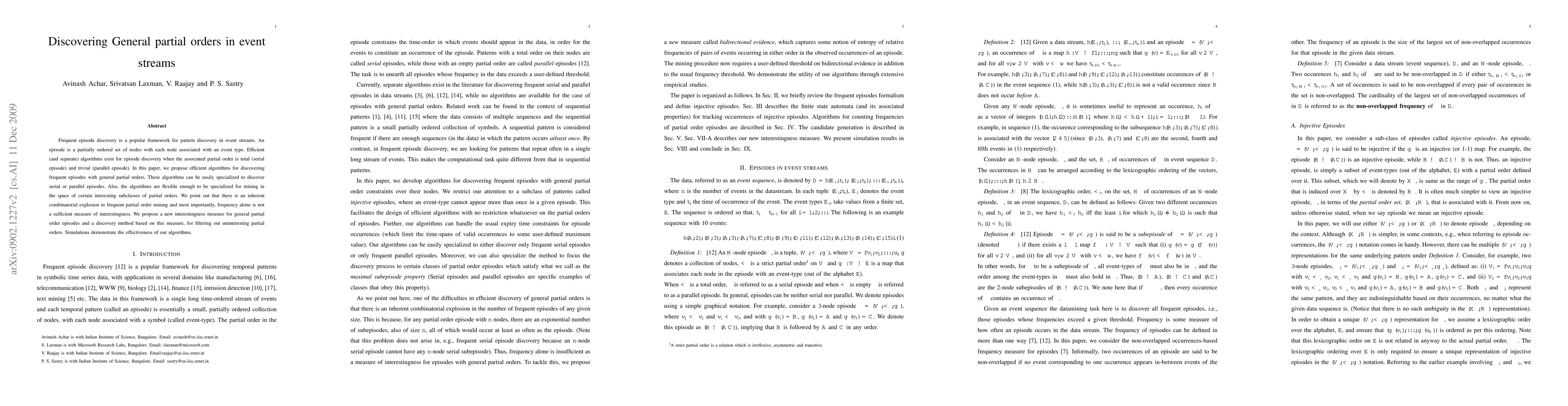 This paper proposes efficient algorithms for discovering frequent episodes with general partial orders in event streams, addressing the combinatorial explosion issue and introducing a new interestingness measure to filter out uninteresting partial orders. The algorithms can be specialized for serial or parallel episodes and for mining specific subclasses of partial orders.