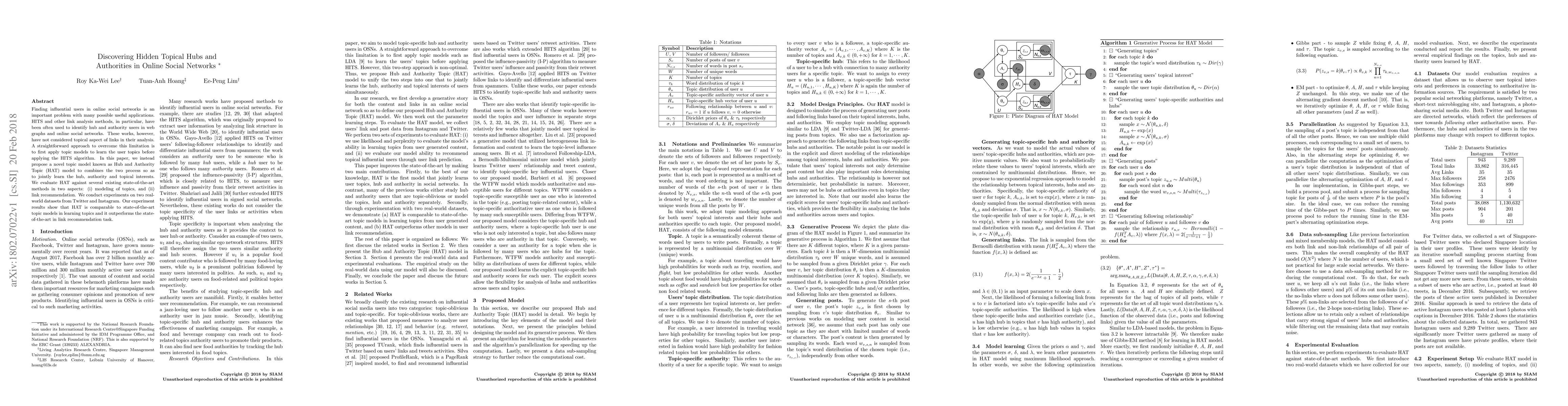 This paper proposes a novel Hub and Authority Topic (HAT) model to jointly identify influential users (hubs) and their topical authorities in online social networks, outperforming existing methods in link recommendation while being competitive in topic modeling. Experiments on Twitter and Instagram datasets validate the HAT model's effectiveness.