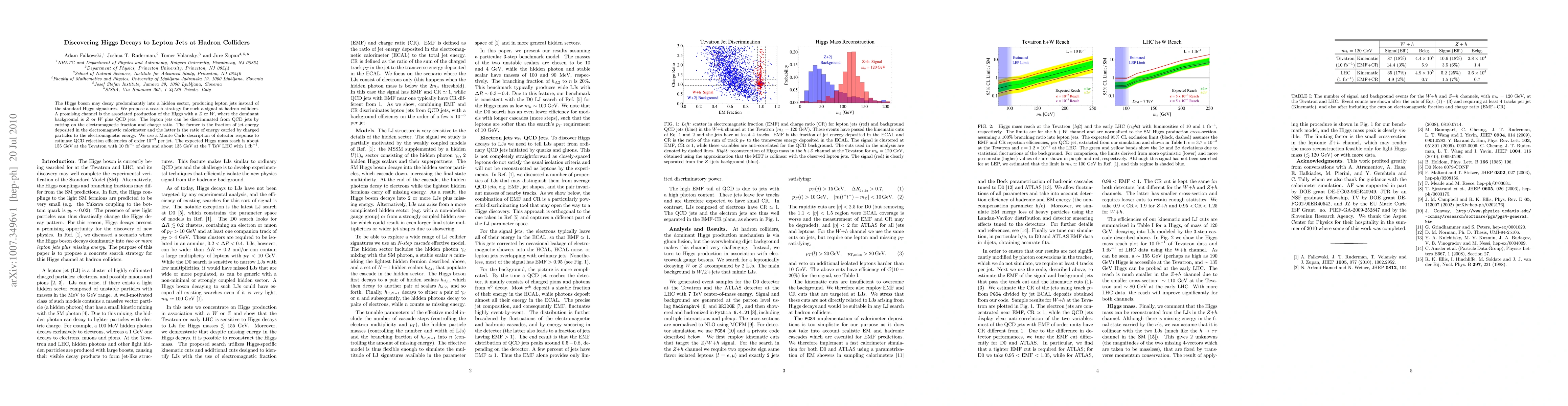 The Higgs boson may decay predominantly into a hidden sector, producing lepton jets instead of the standard Higgs signatures. We propose a search strategy for such a signal at hadron colliders. A promising channel is the associated production of the Higgs with a Z or W, where the dominant background is Z or W plus QCD jets. The lepton jets can be discriminated from QCD jets by cutting on the electromagnetic fraction and charge ratio. The former is the fraction of jet energy deposited in the electromagnetic calorimeter and the latter is the ratio of energy carried by charged particles to the electromagnetic energy. We use a Monte Carlo description of detector response to estimate QCD rejection efficiencies of order 10^-3 per jet. The expected Higgs mass reach is about 155 GeV at the Tevatron with 10 fb^-1 of data and about 135 GeV at the 7 TeV LHC with 1 fb^-1.