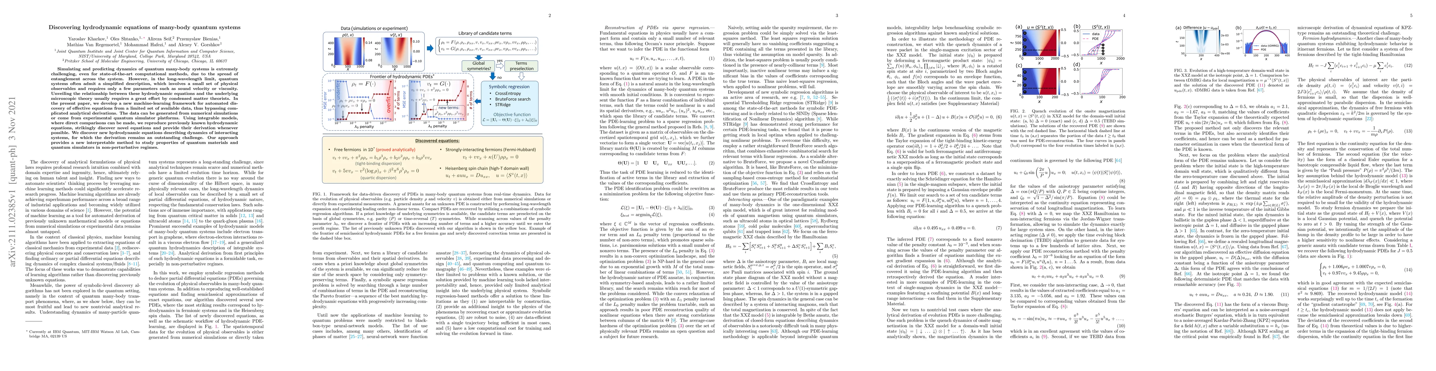 Simulating and predicting dynamics of quantum many-body systems is extremely challenging, even for state-of-the-art computational methods, due to the spread of entanglement across the system. However, in the long-wavelength limit, quantum systems often admit a simplified description, which involves a small set of physical observables and requires only a few parameters such as sound velocity or viscosity. Unveiling the relationship between these hydrodynamic equations and the underlying microscopic theory usually requires a great effort by condensed matter theorists. In the present paper, we develop a new machine-learning framework for automated discovery of effective equations from a limited set of available data, thus bypassing complicated analytical derivations. The data can be generated from numerical simulations or come from experimental quantum simulator platforms. Using integrable models, where direct comparisons can be made, we reproduce previously known hydrodynamic equations, strikingly discover novel equations and provide their derivation whenever possible. We discover new hydrodynamic equations describing dynamics of interacting systems, for which the derivation remains an outstanding challenge. Our approach provides a new interpretable method to study properties of quantum materials and quantum simulators in non-perturbative regimes.