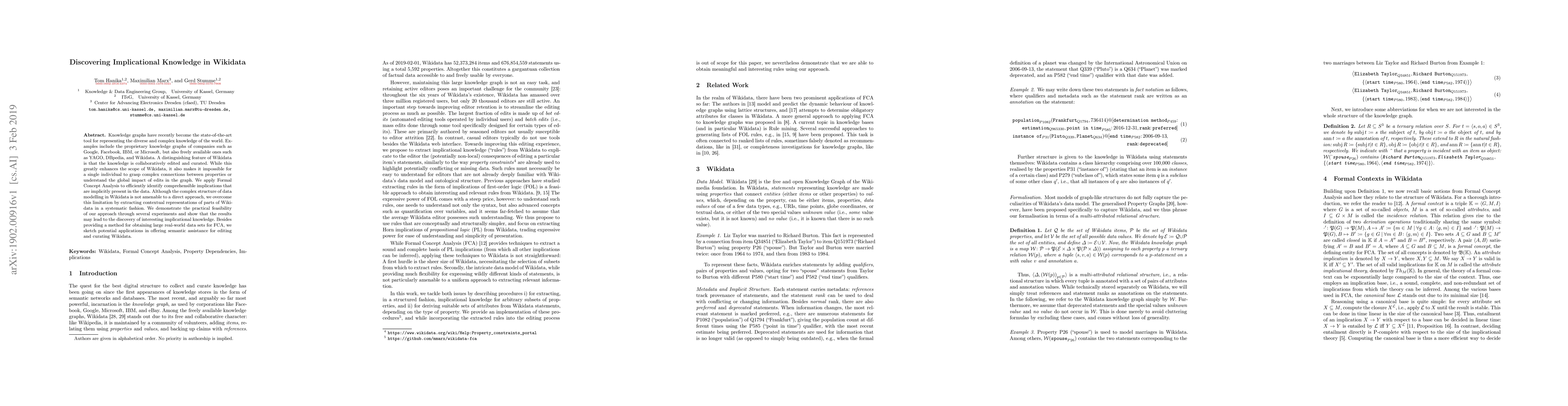 This paper explores the application of Formal Concept Analysis to extract comprehensible implicational knowledge from Wikidata, a collaboratively curated knowledge graph. The authors demonstrate a systematic method for identifying implicit connections and present experiments showing the practical feasibility and potential applications in aiding the editing and curation of Wikidata.