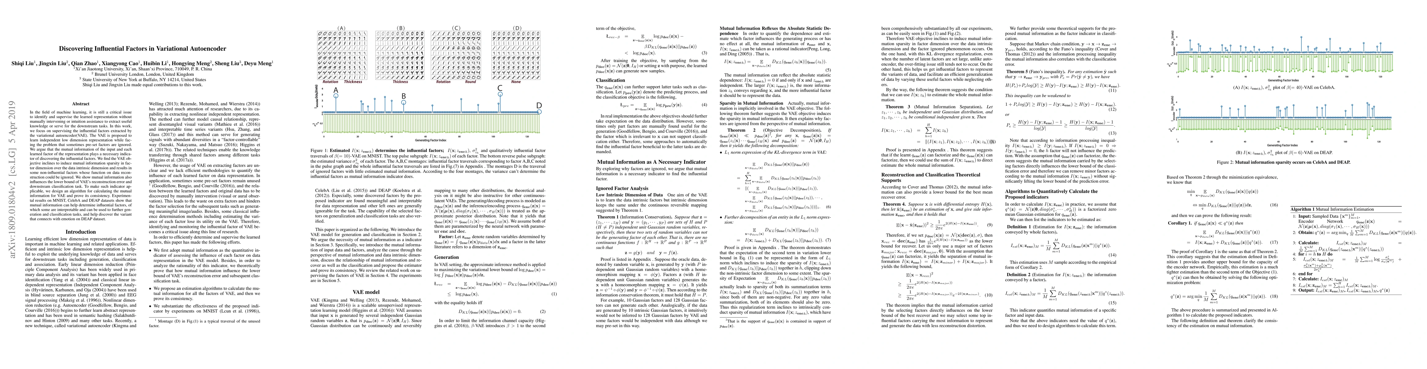 In the field of machine learning, it is still a critical issue to identify and supervise the learned representation without manually intervening or intuition assistance to extract useful knowledge or serve for the downstream tasks. In this work, we focus on supervising the influential factors extracted by the variational autoencoder(VAE). The VAE is proposed to learn independent low dimension representation while facing the problem that sometimes pre-set factors are ignored. We argue that the mutual information of the input and each learned factor of the representation plays a necessary indicator of discovering the influential factors. We find the VAE objective inclines to induce mutual information sparsity in factor dimension over the data intrinsic dimension and results in some non-influential factors whose function on data reconstruction could be ignored. We show mutual information also influences the lower bound of VAE's reconstruction error and downstream classification task. To make such indicator applicable, we design an algorithm for calculating the mutual information for VAE and prove its consistency. Experimental results on MNIST, CelebA and DEAP datasets show that mutual information can help determine influential factors, of which some are interpretable and can be used to further generation and classification tasks, and help discover the variant that connects with emotion on DEAP dataset.