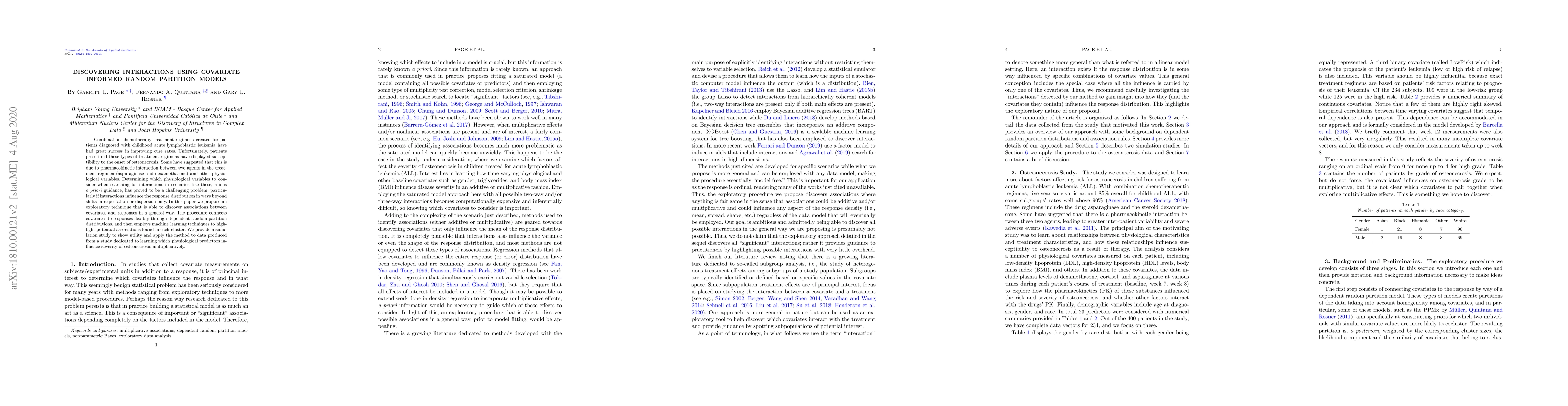 Combination chemotherapy treatment regimens created for patients diagnosed with childhood acute lymphoblastic leukemia have had great success in improving cure rates. Unfortunately, patients prescribed these types of treatment regimens have displayed susceptibility to the onset of osteonecrosis. Some have suggested that this is due to pharmacokinetic interaction between two agents in the treatment regimen (asparaginase and dexamethasone) and other physiological variables. Determining which physiological variables to consider when searching for interactions in scenarios like these, minus a priori guidance, has proved to be a challenging problem, particularly if interactions influence the response distribution in ways beyond shifts in expectation or dispersion only. In this paper we propose an exploratory technique that is able to discover associations between covariates and responses in a very general way. The procedure connects covariates to responses very flexibly through dependent random partition prior distributions, and then employs machine learning techniques to highlight potential associations found in each cluster. We provide a simulation study to show utility and apply the method to data produced from a study dedicated to learning which physiological predictors influence severity of osteonecrosis multiplicatively.