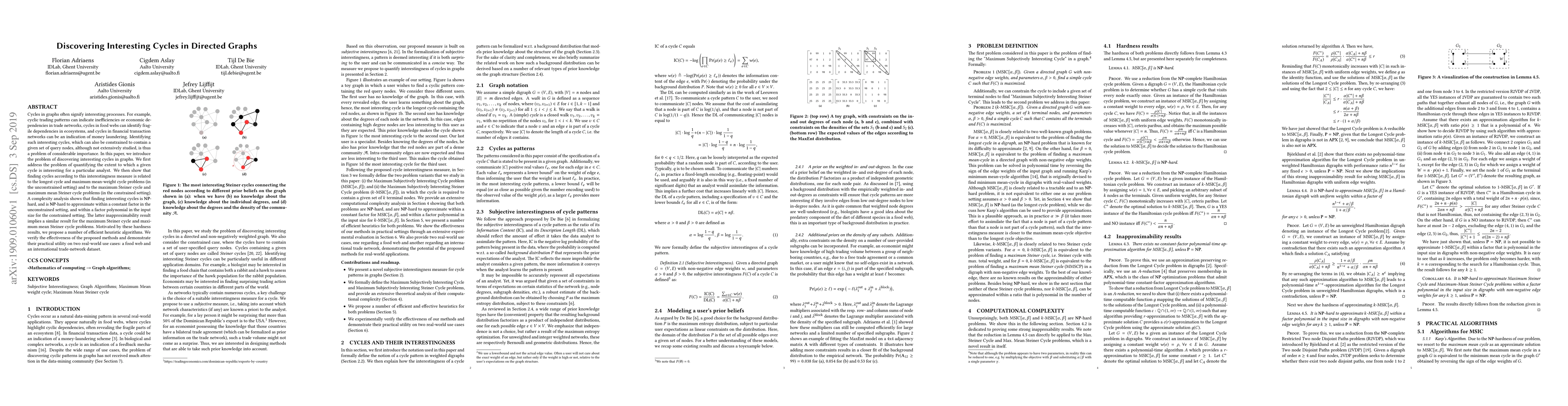 This paper explores the problem of identifying interesting cycles in directed graphs, which can reveal significant patterns in networks like trade, food webs, and financial transactions. The authors propose a measure of interestingness for cycles and show that finding such cycles is NP-hard, leading to the development of efficient heuristic algorithms. They validate these algorithms on real-world datasets, demonstrating their practical utility.