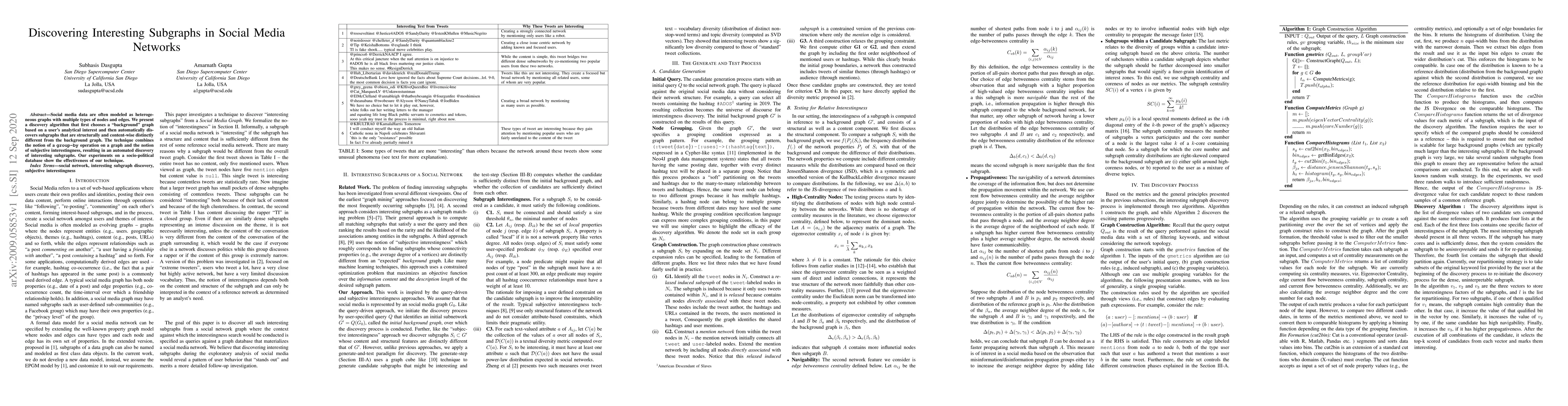 Social media data are often modeled as heterogeneous graphs with multiple types of nodes and edges. We present a discovery algorithm that first chooses a "background" graph based on a user's analytical interest and then automatically discovers subgraphs that are structurally and content-wise distinctly different from the background graph. The technique combines the notion of a \texttt{group-by} operation on a graph and the notion of subjective interestingness, resulting in an automated discovery of interesting subgraphs. Our experiments on a socio-political database show the effectiveness of our technique.