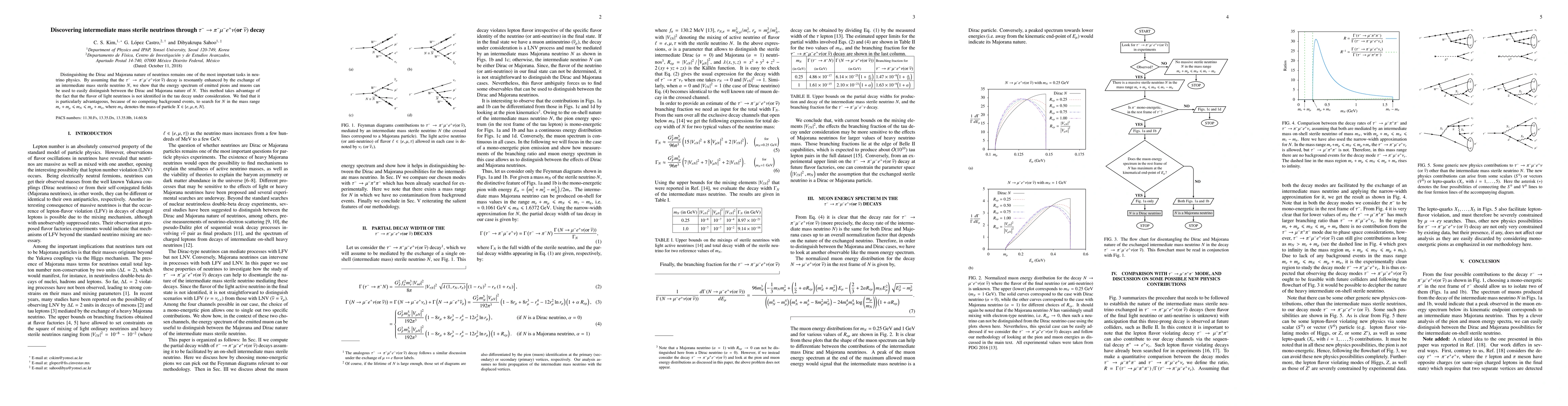 Distinguishing the Dirac and Majorana nature of neutrinos remains one of the most important tasks in neutrino physics. By assuming that the $\tau^- \to \pi^- \mu^- e^+ \nu$ (or $\bar{\nu}$) decay is resonantly enhanced by the exchange of an intermediate mass sterile neutrino $N$, we show that the energy spectrum of emitted pions and muons can be used to easily distinguish between the Dirac and Majorana nature of $N$. This method takes advantage of the fact that the flavor of light neutrinos is not identified in the tau decay under consideration. We find that it is particularly advantageous, because of no competing background events, to search for $N$ in the mass range $m_e + m_{\mu} \leqslant m_N \leqslant m_{\mu} + m_{\pi}$, where $m_X$ denotes the mass of particle $X \in \{ e, \mu, \pi, N \}$.