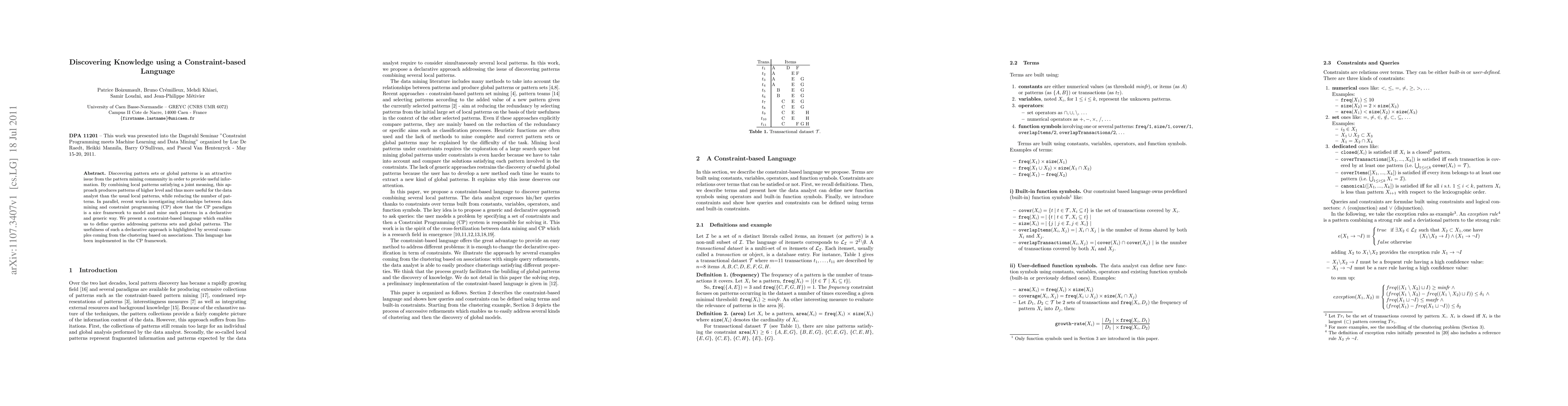 This paper introduces a constraint-based language to model and mine global patterns by combining local patterns, leveraging the declarative framework of constraint programming. The approach reduces the number of patterns while enhancing their usefulness, demonstrated through examples in clustering based on associations.
