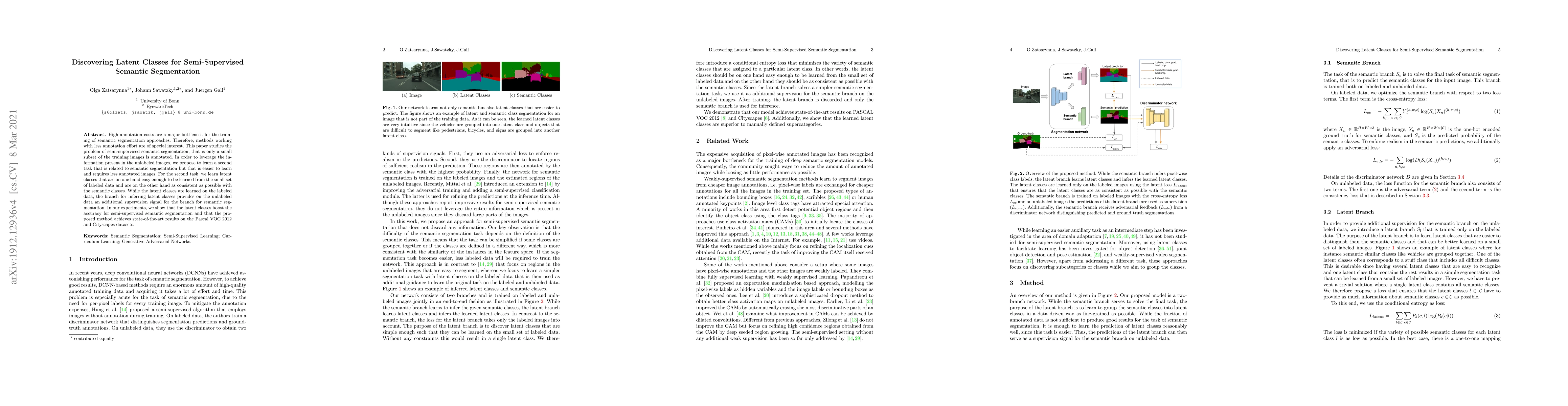 This paper proposes a method for semi-supervised semantic segmentation that leverages unlabeled images by learning related, easier latent classes. The approach achieves state-of-the-art results on Pascal VOC and Cityscapes datasets.