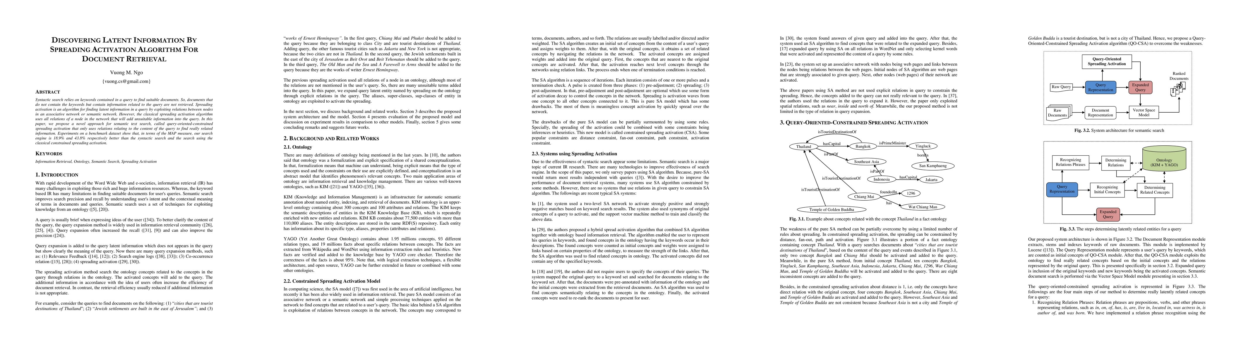 Syntactic search relies on keywords contained in a query to find suitable documents. So, documents that do not contain the keywords but contain information related to the query are not retrieved. Spreading activation is an algorithm for finding latent information in a query by exploiting relations between nodes in an associative network or semantic network. However, the classical spreading activation algorithm uses all relations of a node in the network that will add unsuitable information into the query. In this paper, we propose a novel approach for semantic text search, called query-oriented-constrained spreading activation that only uses relations relating to the content of the query to find really related information. Experiments on a benchmark dataset show that, in terms of the MAP measure, our search engine is 18.9% and 43.8% respectively better than the syntactic search and the search using the classical constrained spreading activation. KEYWORDS: Information Retrieval, Ontology, Semantic Search, Spreading Activation