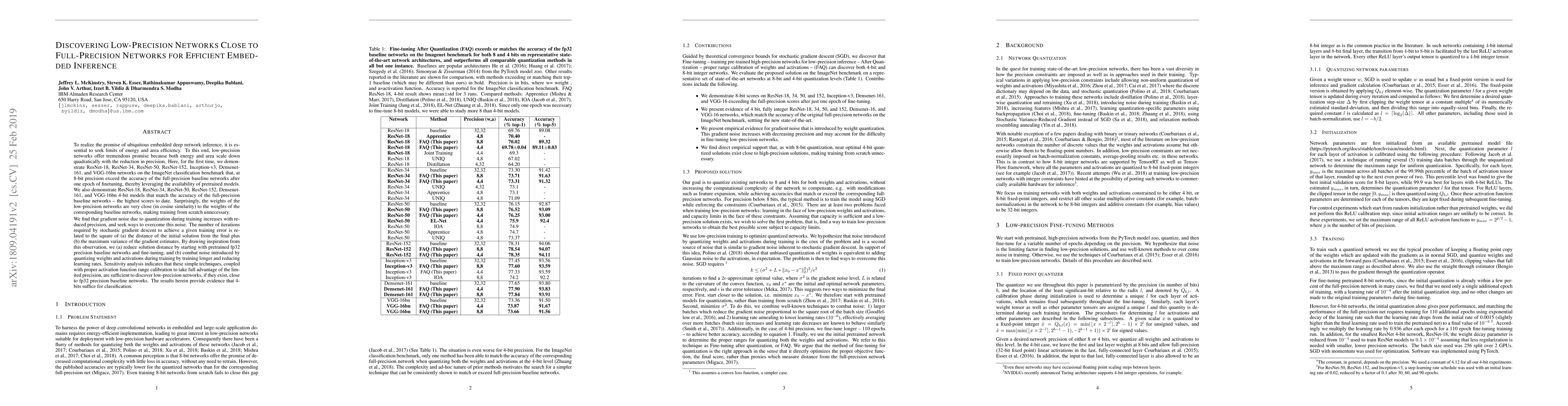 Researchers find that reducing network precision from full-precision to 8-bit or 4-bit can achieve similar accuracy with minimal training, allowing for more energy-efficient embedded inference.