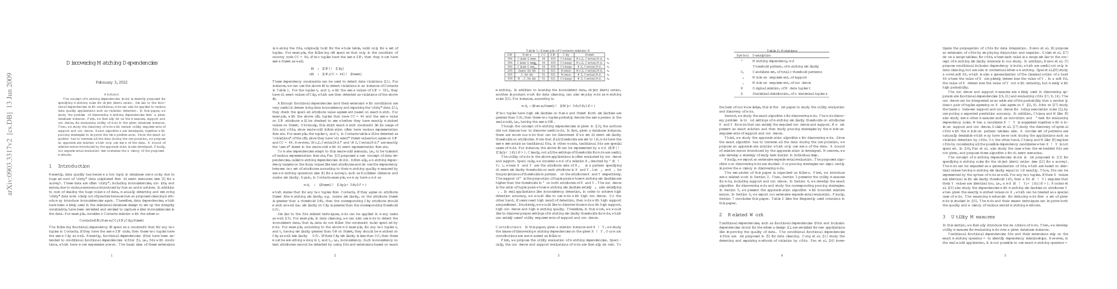 This paper introduces matching dependencies (mds) for object identification and data quality applications, proposing measures to evaluate their utility. It develops exact and approximate algorithms for discovering mds, along with pruning strategies and bounds on error, and shows their efficiency through experiments.