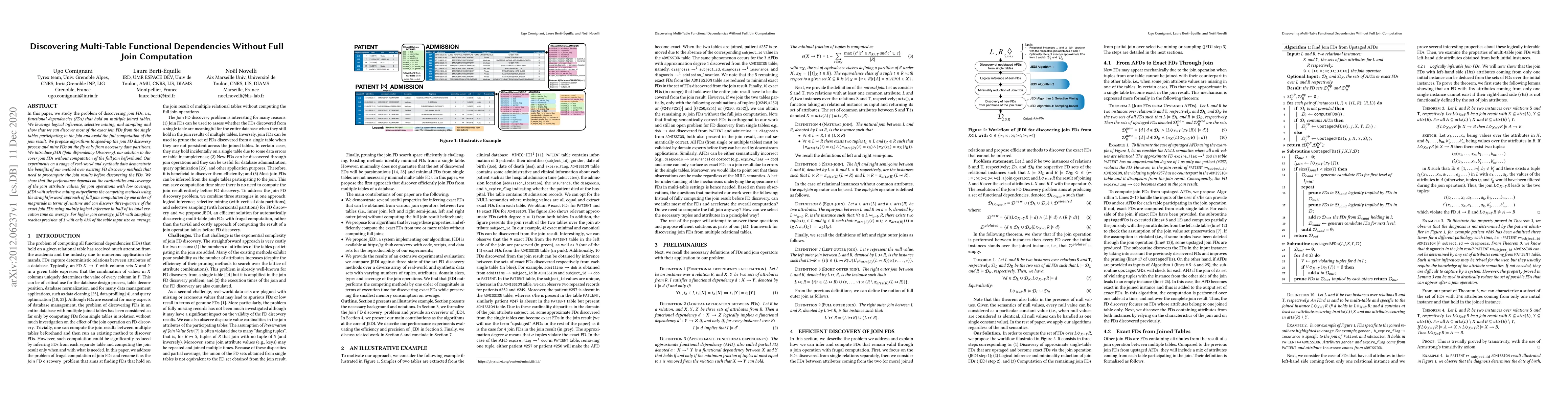 This paper proposes JEDI, an algorithm for discovering multi-table functional dependencies without computing the full join, leveraging logical inference, selective mining, and sampling to significantly speed up the process. Experiments show JEDI outperforms traditional methods, especially for joins with low coverage, achieving an order of magnitude faster runtime and high accuracy.