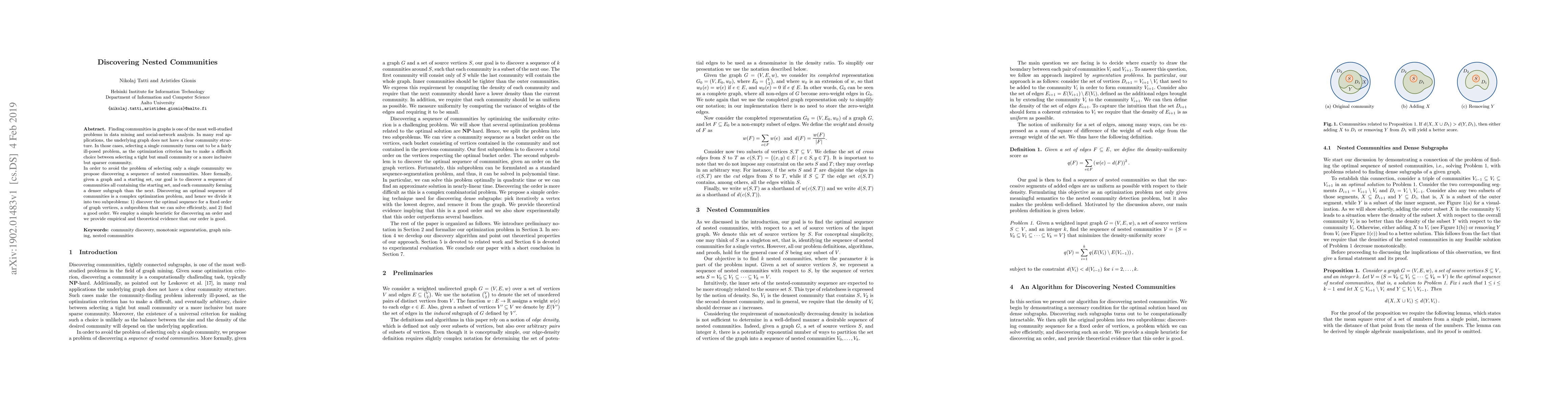 This paper proposes a method to discover nested communities in graphs, addressing the challenge of selecting a single community when the graph lacks clear structure. Instead, it finds a sequence of nested communities, each denser than the last, and presents a heuristic approach to determine the optimal order of vertices to achieve this.
