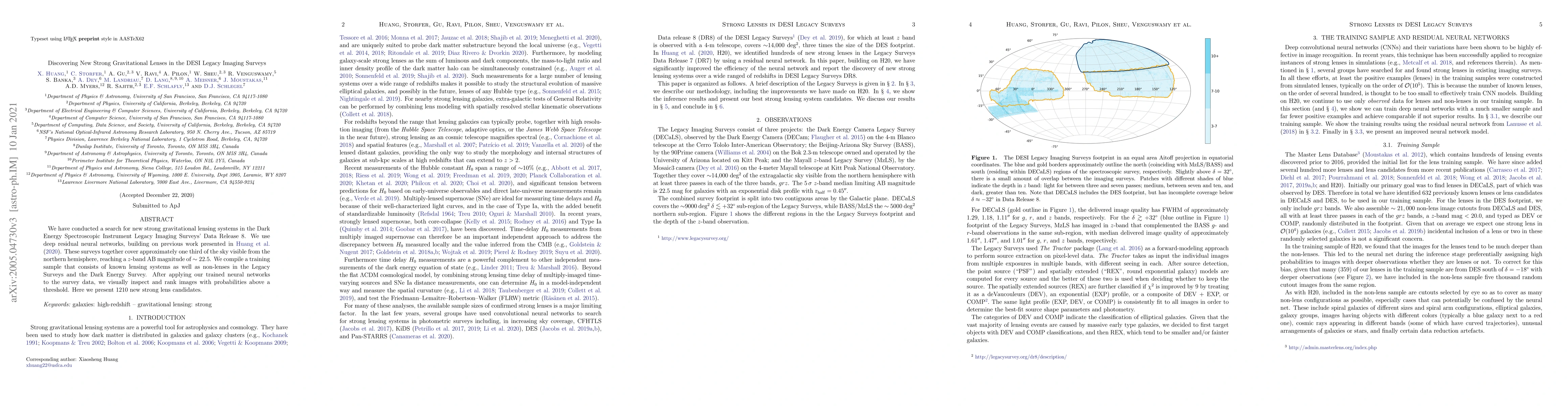 We have conducted a search for new strong gravitational lensing systems in the Dark Energy Spectroscopic Instrument Legacy Imaging Surveys' Data Release 8. We use deep residual neural networks, building on previous work presented in Huang et al. (2020). These surveys together cover approximately one third of the sky visible from the northern hemisphere, reaching a z band AB magnitude of ~22.5. We compile a training sample that consists of known lensing systems as well as non-lenses in the Legacy Surveys and the Dark Energy Survey. After applying our trained neural networks to the survey data, we visually inspect and rank images with probabilities above a threshold. Here we present 1210 new strong lens candidates.