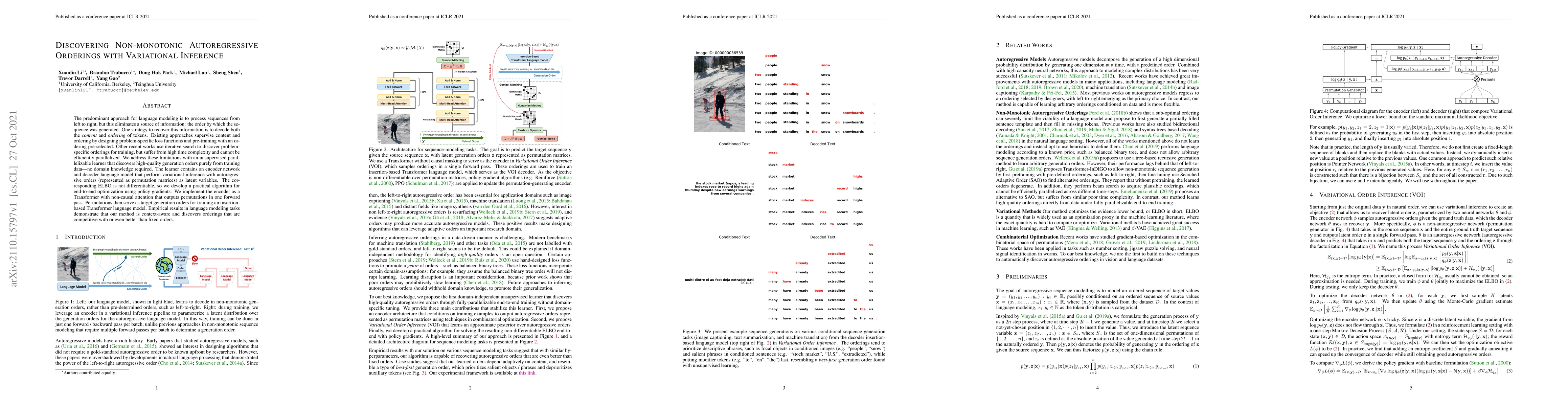 The predominant approach for language modeling is to process sequences from left to right, but this eliminates a source of information: the order by which the sequence was generated. One strategy to recover this information is to decode both the content and ordering of tokens. Existing approaches supervise content and ordering by designing problem-specific loss functions and pre-training with an ordering pre-selected. Other recent works use iterative search to discover problem-specific orderings for training, but suffer from high time complexity and cannot be efficiently parallelized. We address these limitations with an unsupervised parallelizable learner that discovers high-quality generation orders purely from training data -- no domain knowledge required. The learner contains an encoder network and decoder language model that perform variational inference with autoregressive orders (represented as permutation matrices) as latent variables. The corresponding ELBO is not differentiable, so we develop a practical algorithm for end-to-end optimization using policy gradients. We implement the encoder as a Transformer with non-causal attention that outputs permutations in one forward pass. Permutations then serve as target generation orders for training an insertion-based Transformer language model. Empirical results in language modeling tasks demonstrate that our method is context-aware and discovers orderings that are competitive with or even better than fixed orders.